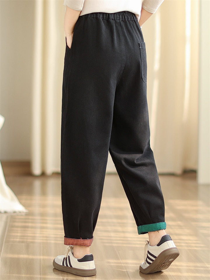 Women's Vintage Flower Embroidered Pockets Elastic Waist Jeans