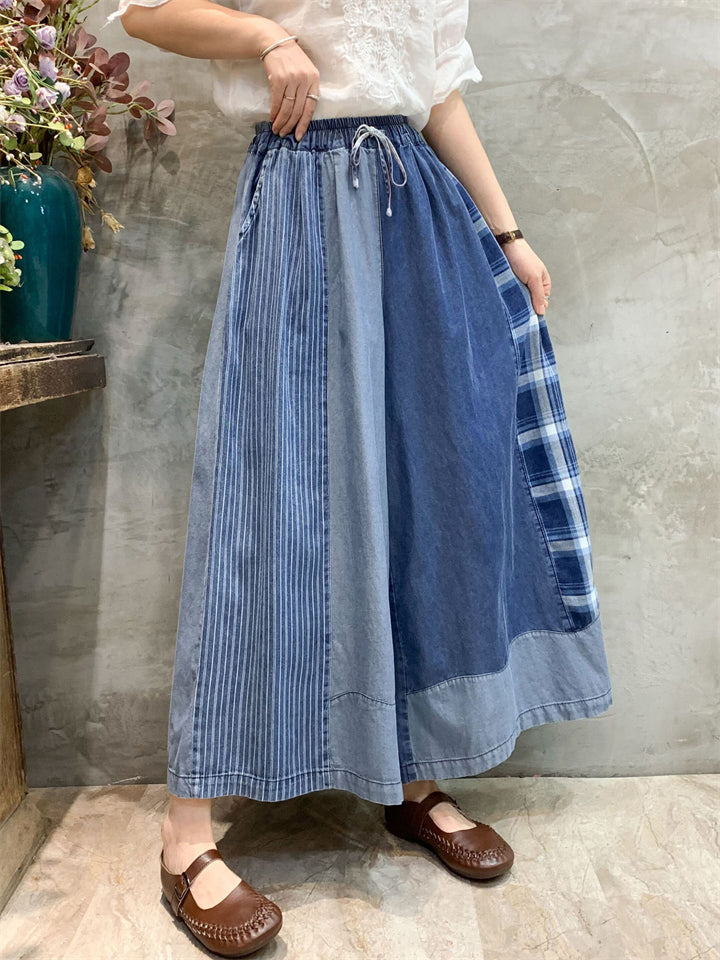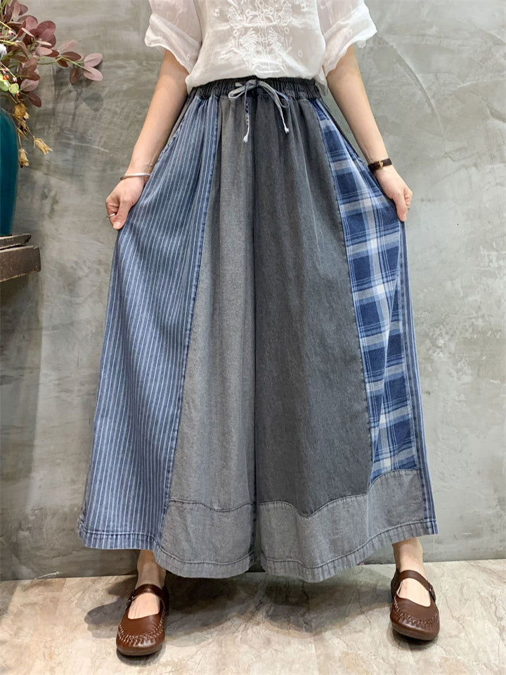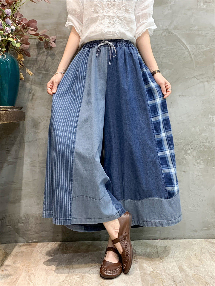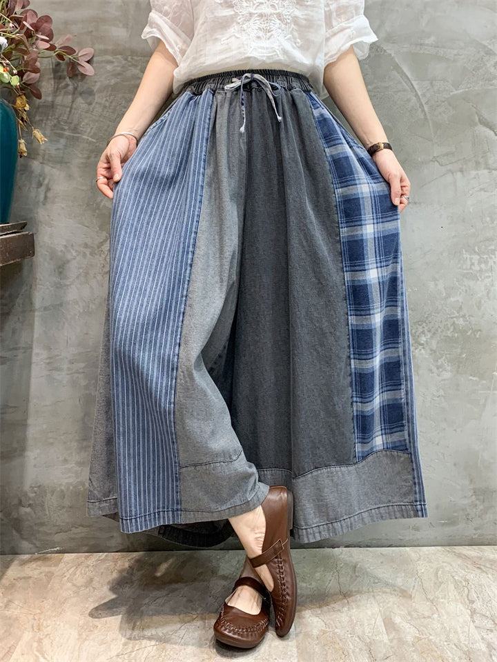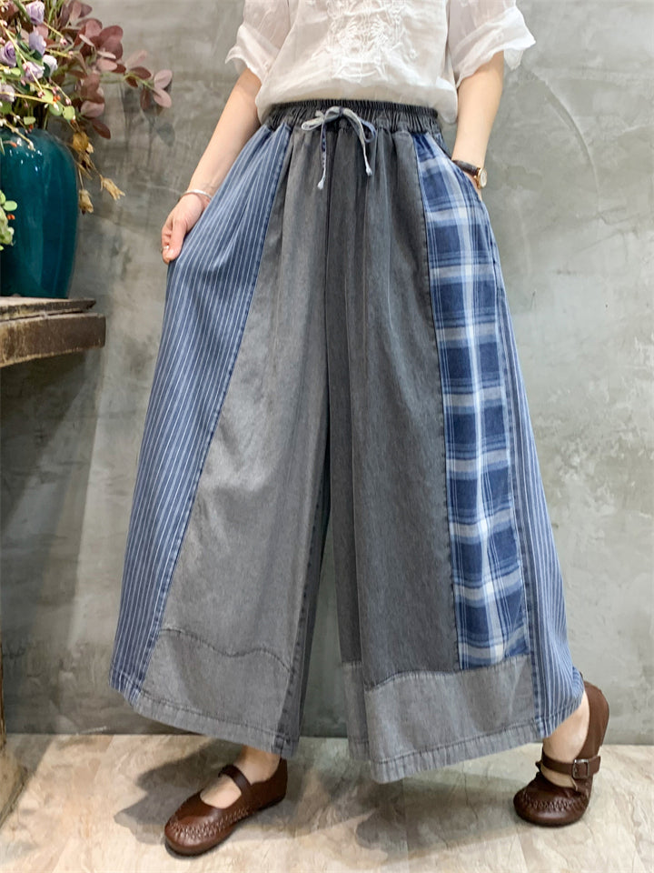 Women's Stylish Plaid Patchwork Drawstring Wide-Leg Jeans