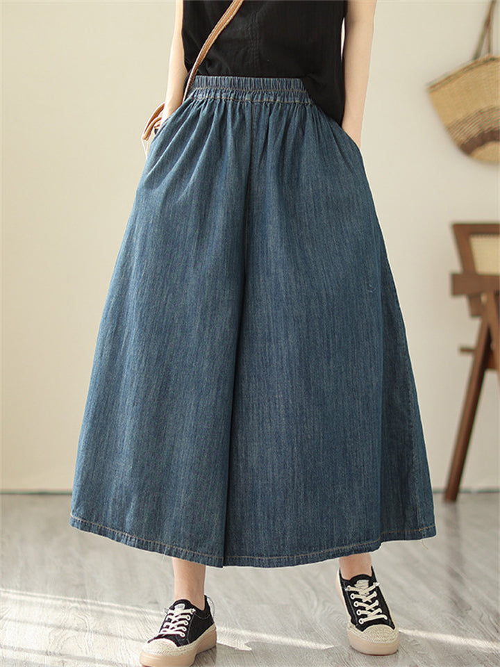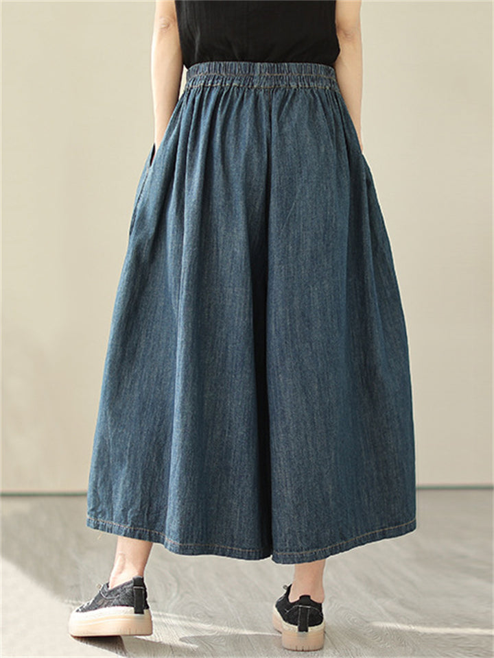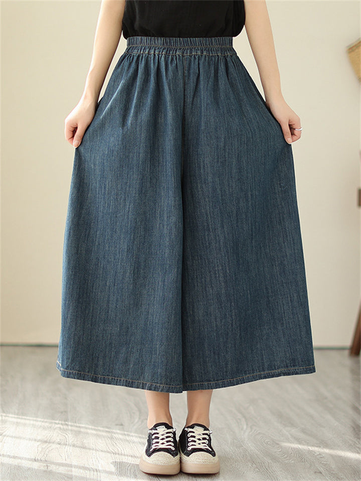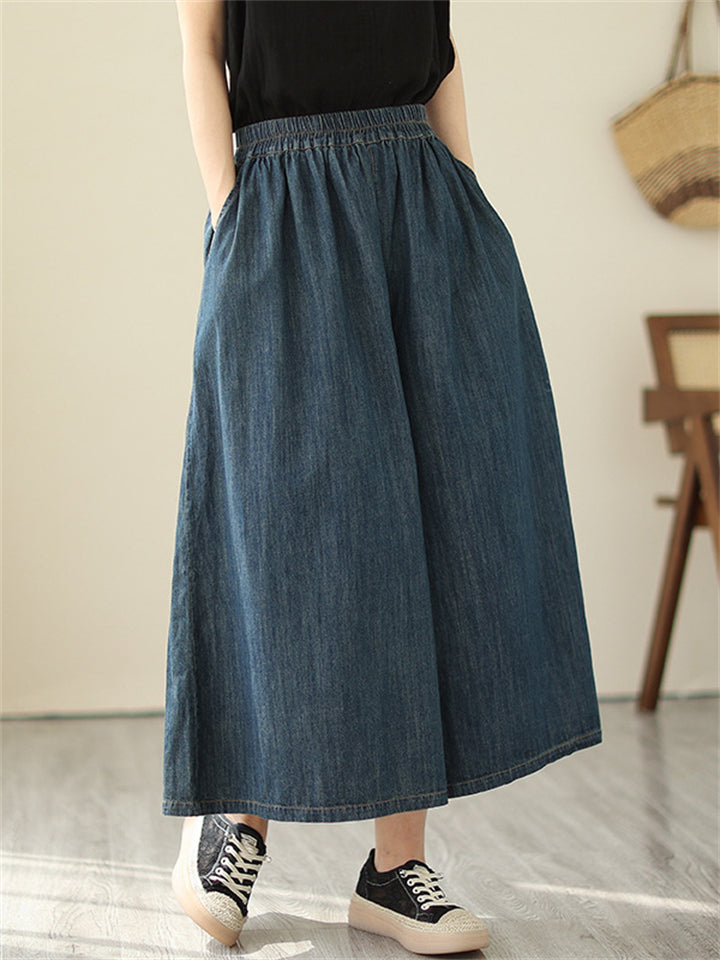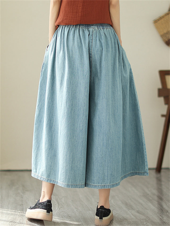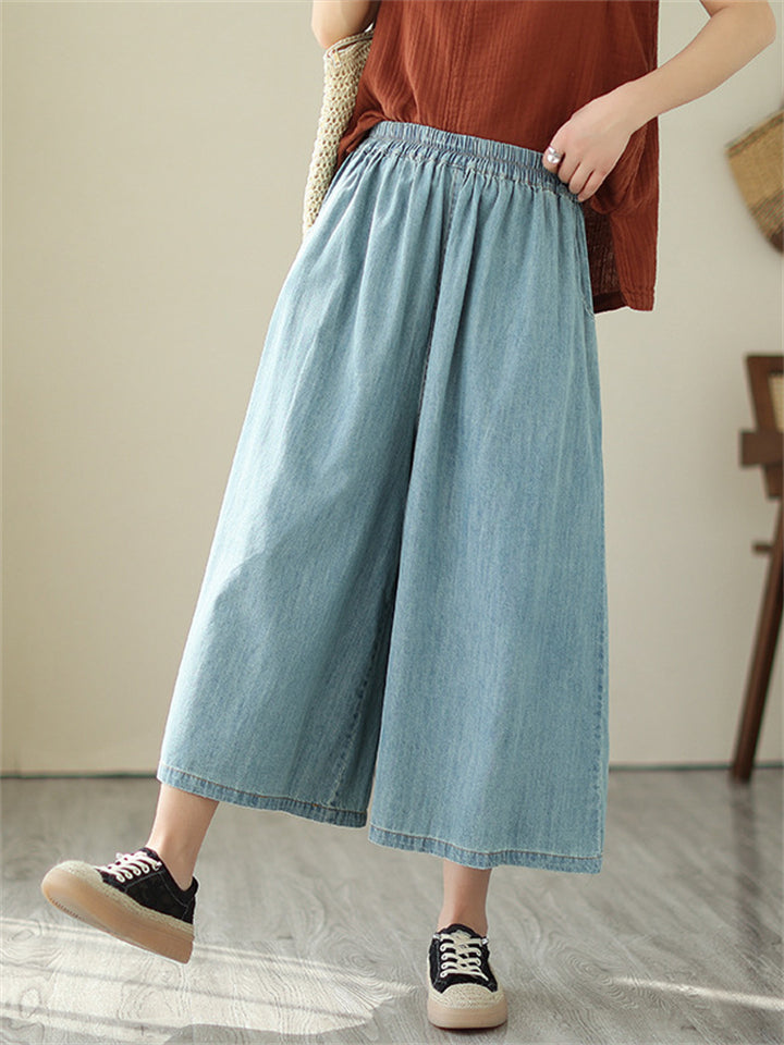 Women's Elastic Waist Wide Leg Cropped Jeans
