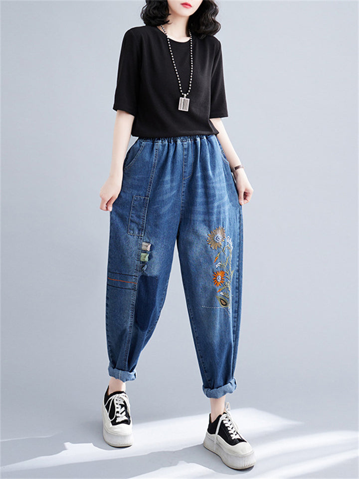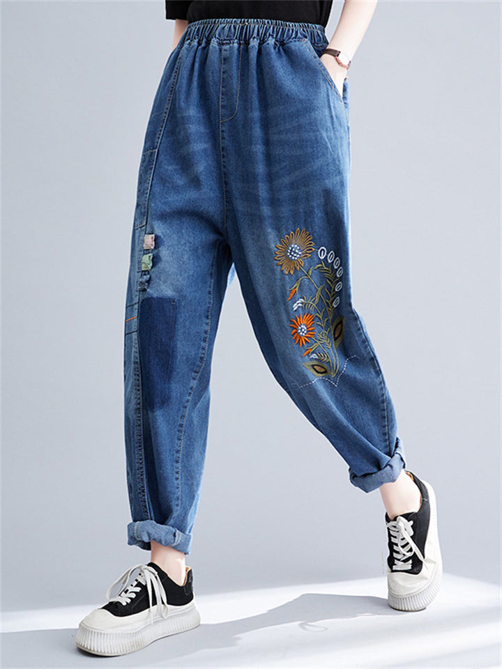 Women's Vintage Flower Embroidered Pockets Elastic Waist Jeans