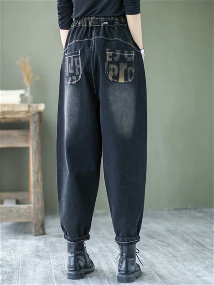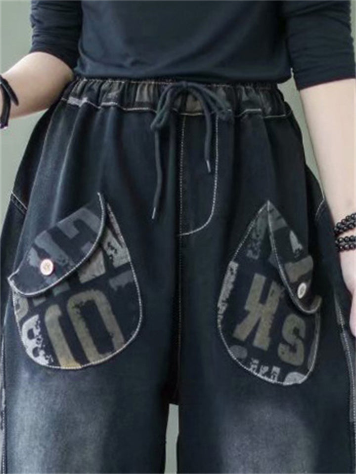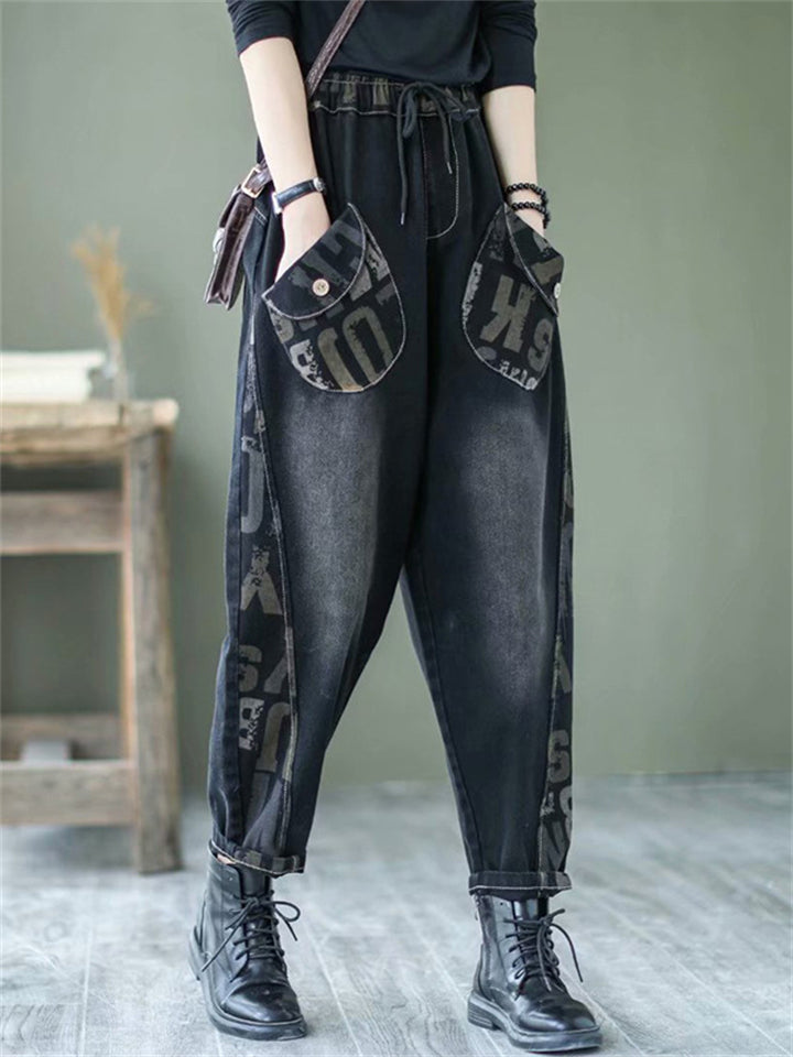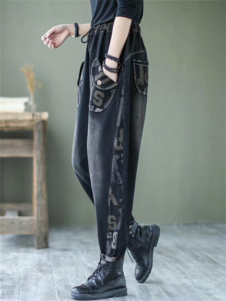Women's Trendy Letter Print Patch Pocket Loose Harem Pants