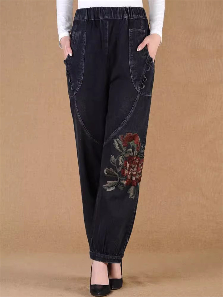 Women's Vintage Flower Embroidered Pockets Elastic Waist Jeans