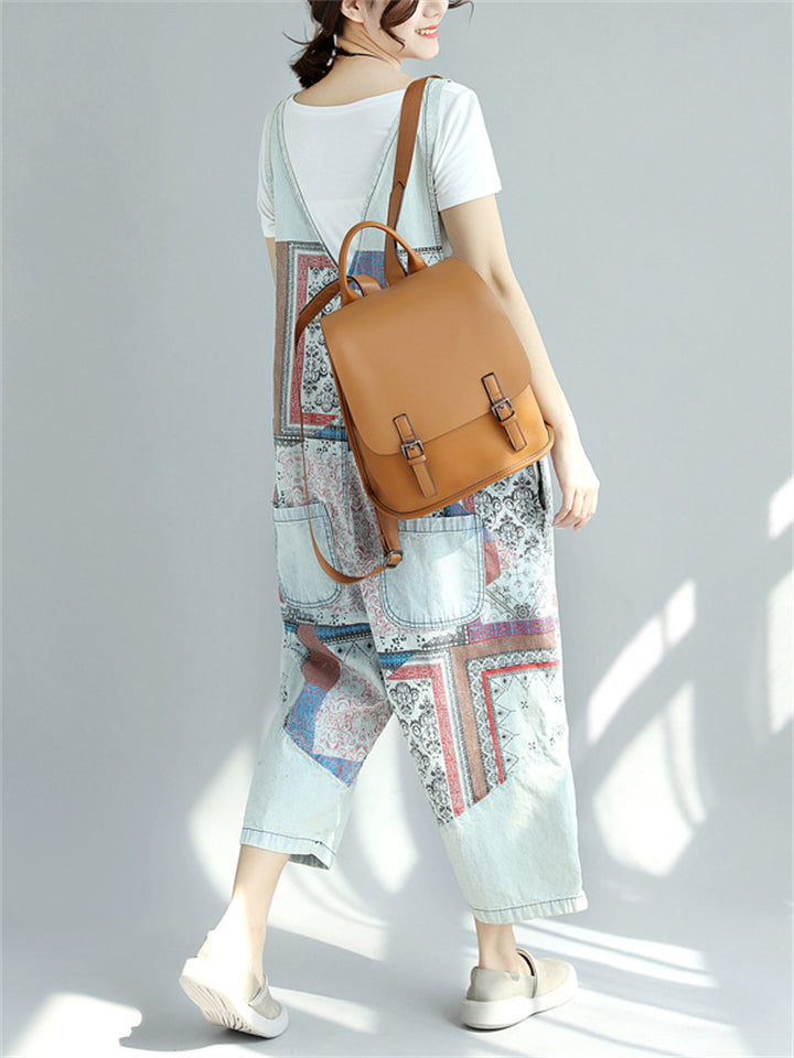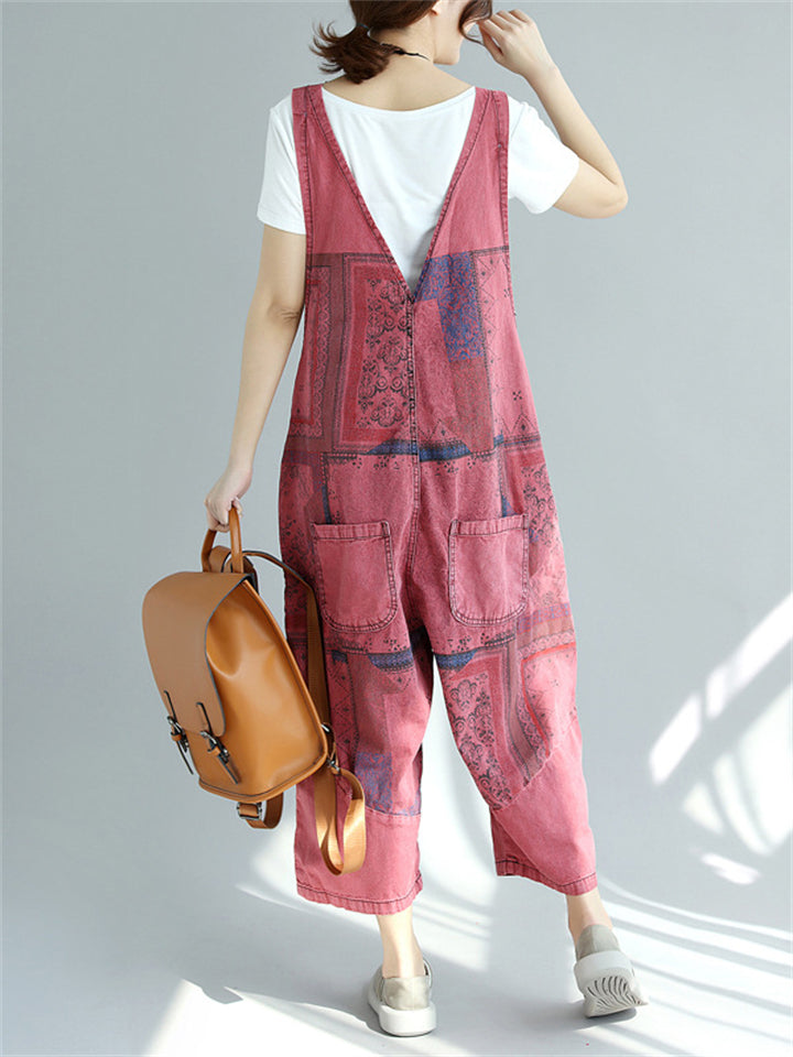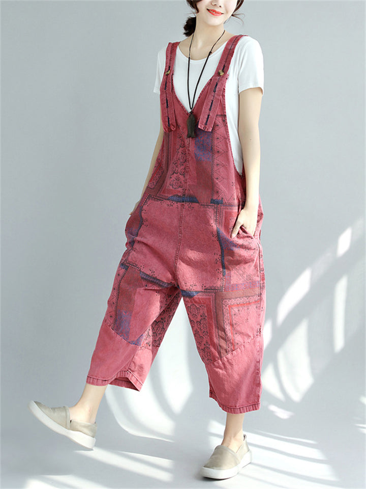 Women's Contrast Color Print Pockets Overall Denim Jumpsuits