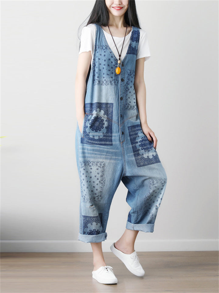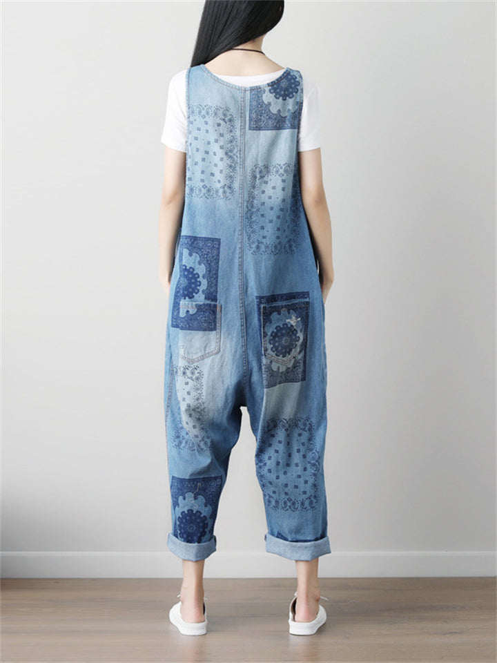 Women's Contrast Color Print Pockets Overall Denim Jumpsuits