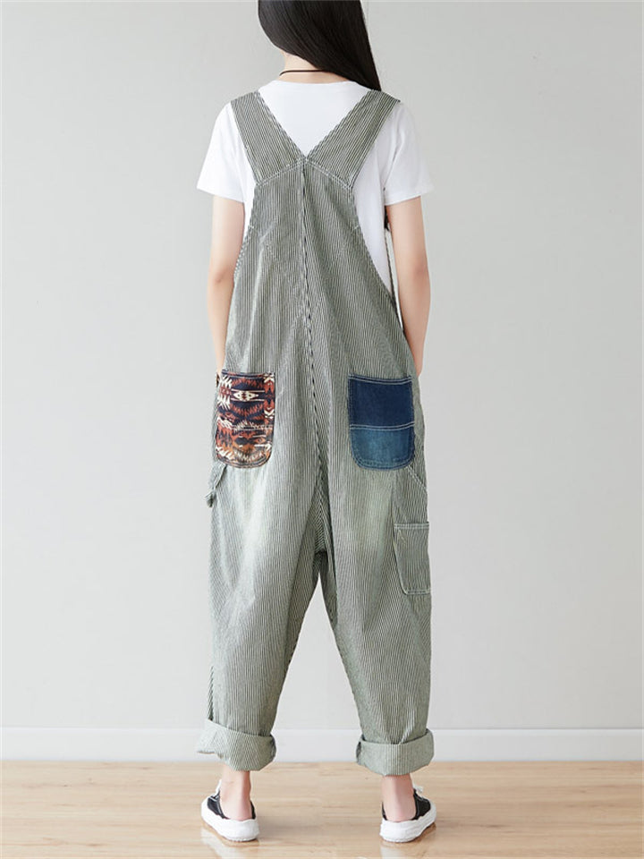 Women's Contrast Color Pockets Loose Overall Denim Jumpsuits
