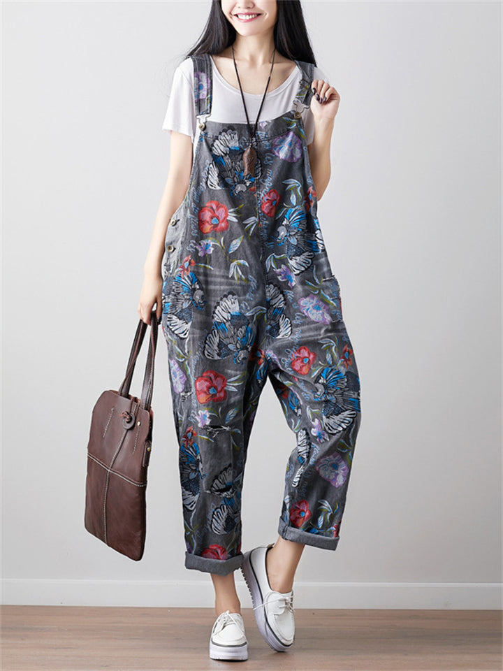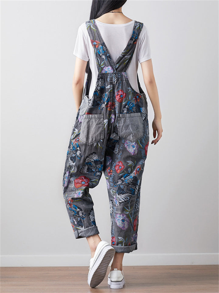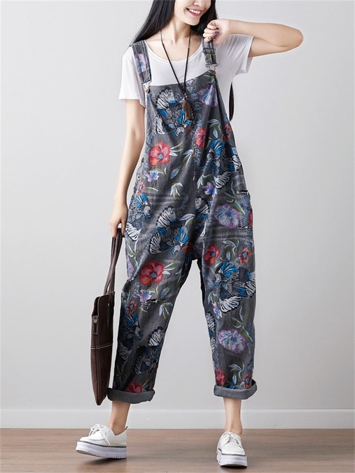 Fashion Loose Flowers Printed Denim Jumpsuits