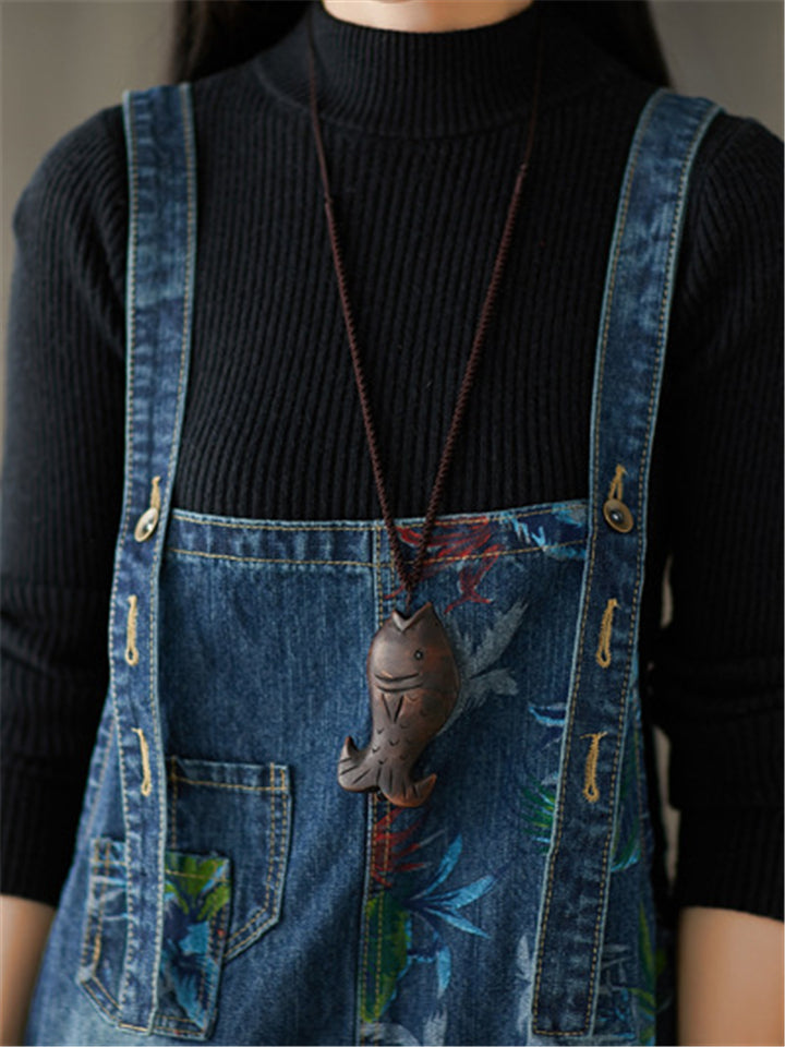 Women's Contrast Color Print Pockets Overall Denim Jumpsuits
