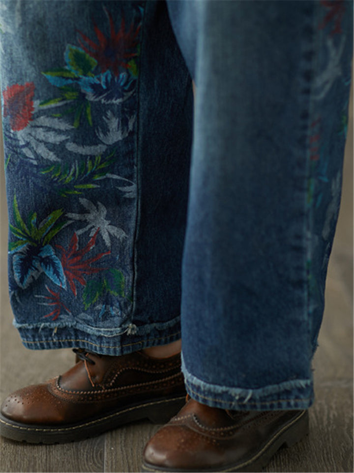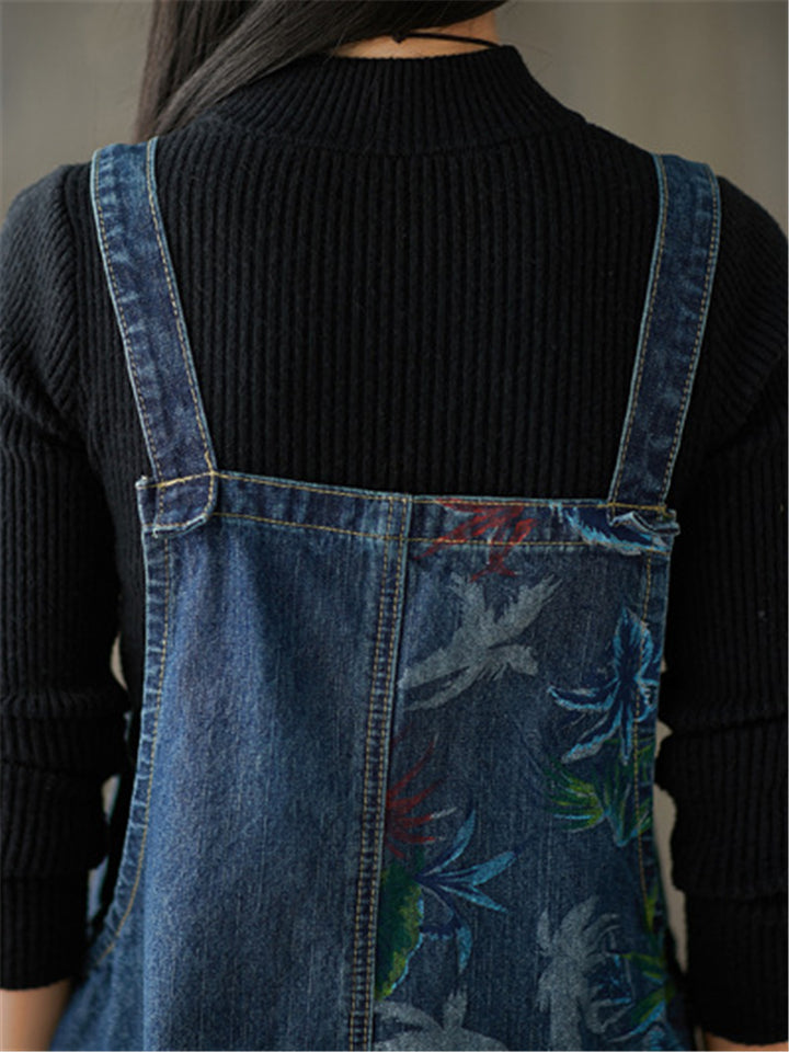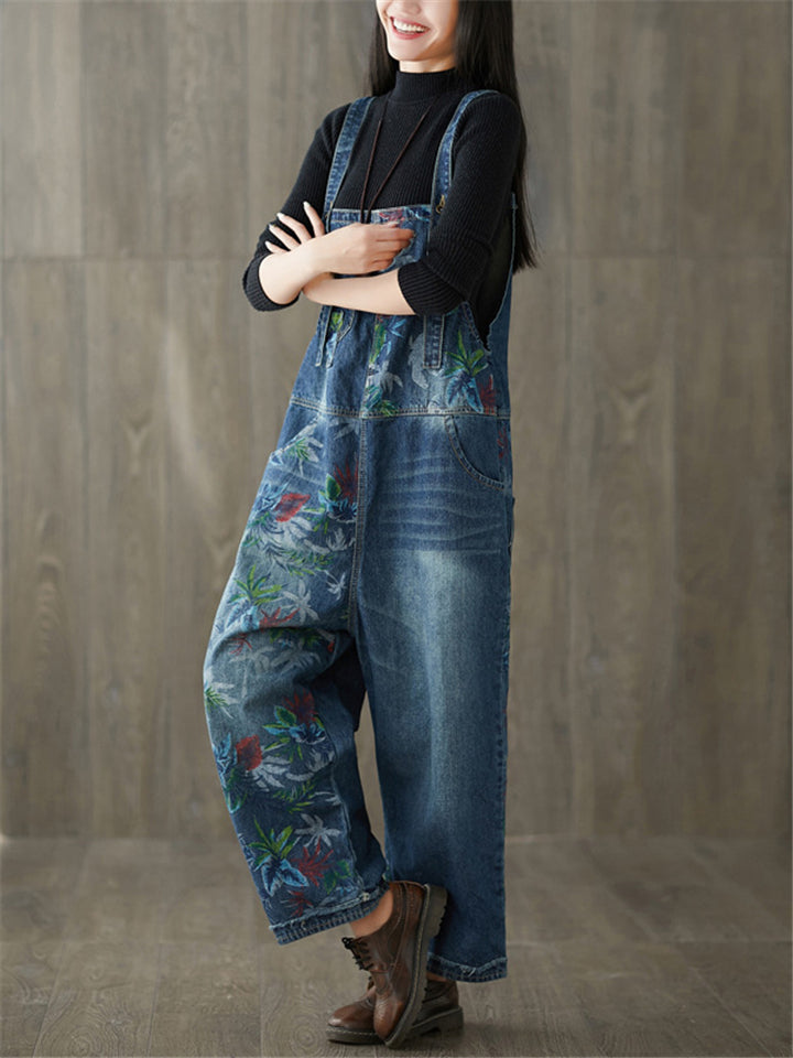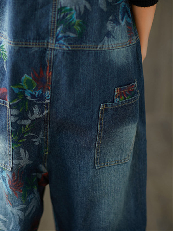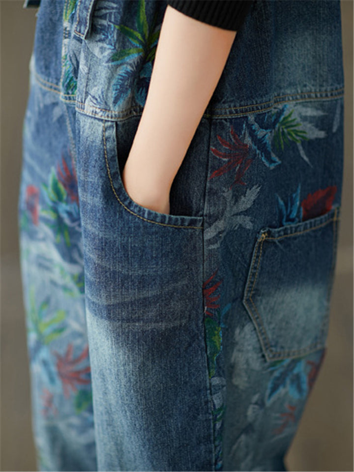 Women's Floral Print Contrast Color Overall Denim Jumpsuits