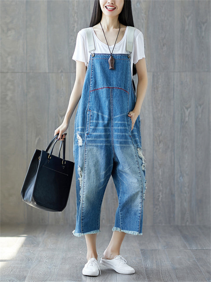 Women's Contrast Color Overall Denim Cropped Jumpsuits