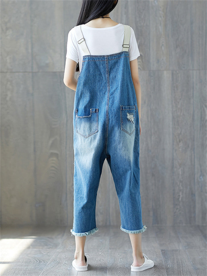 Women's Contrast Color Pockets Loose Overall Denim Jumpsuits