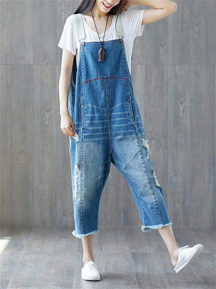 Women's Contrast Color Stripe Overall Denim Cropped Jumpsuits