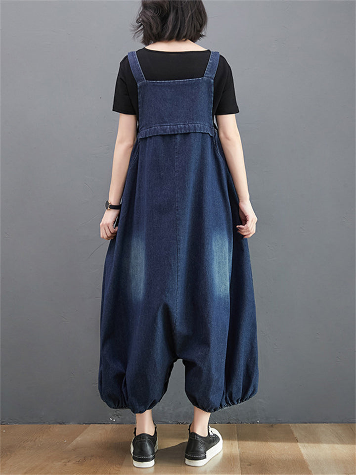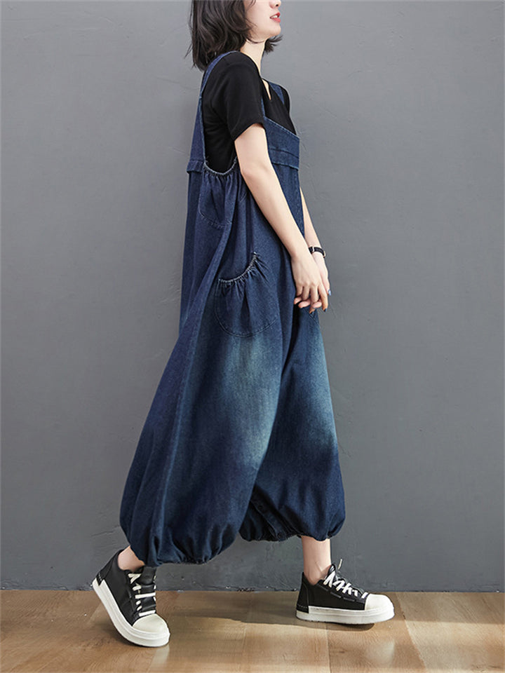 Women's Contrast Color Pockets Loose Overall Denim Jumpsuits