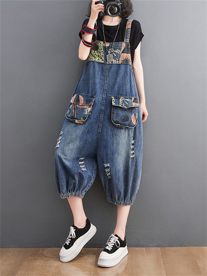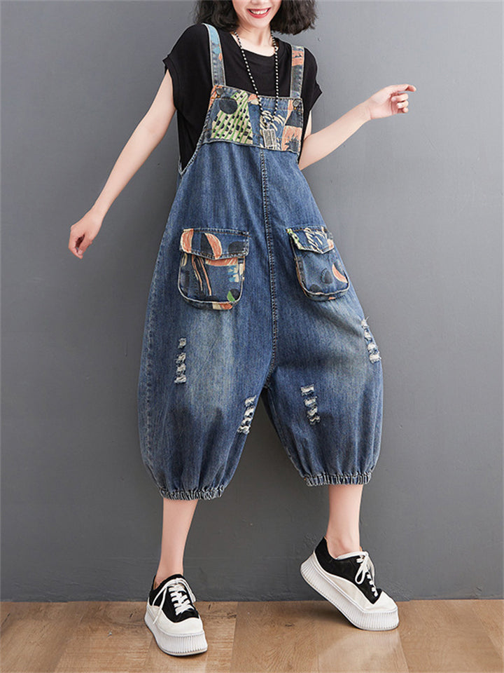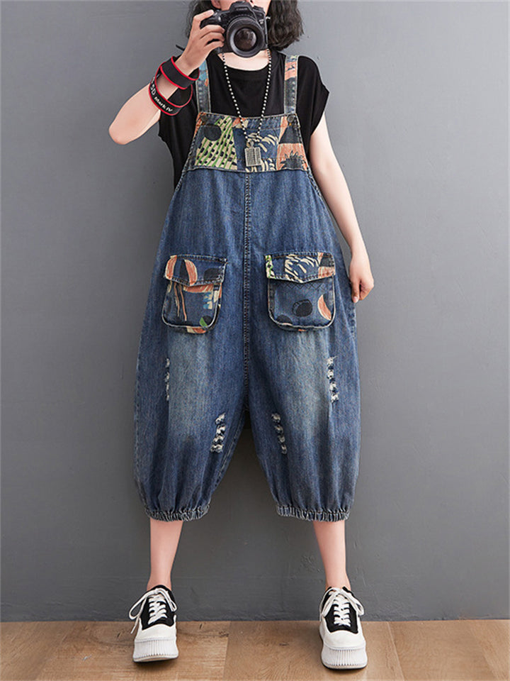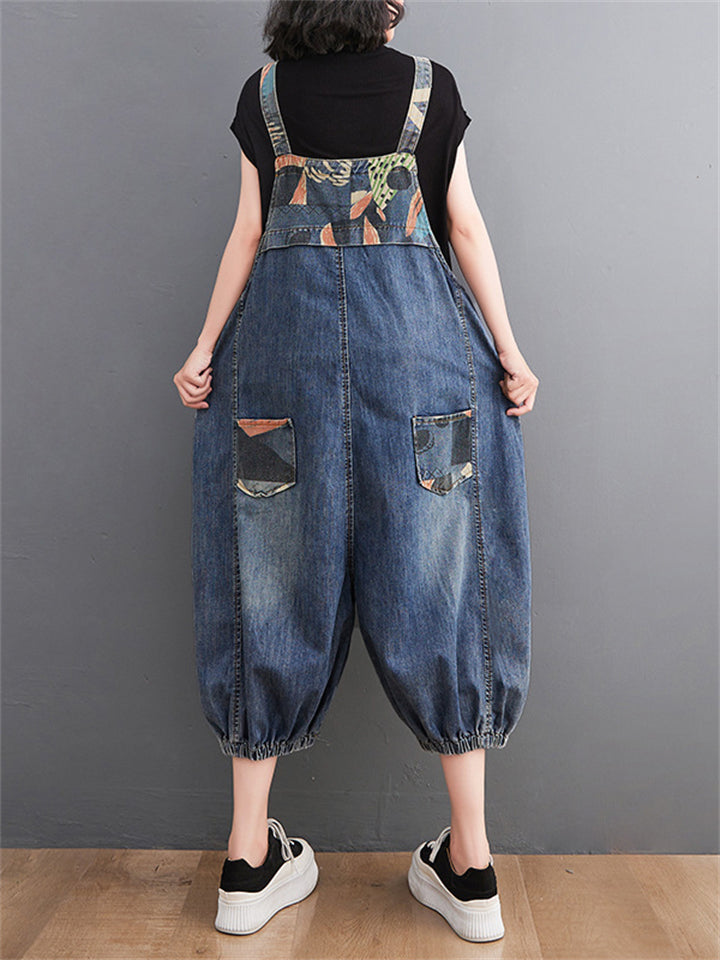 Women's Contrast Color Print Pockets Overall Denim Jumpsuits