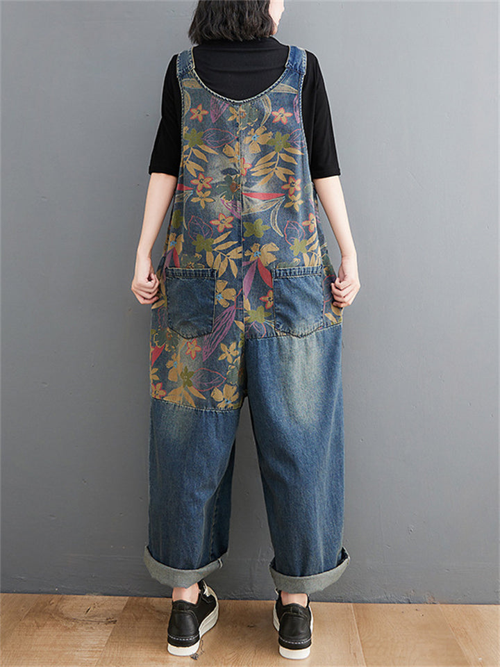 Women's Floral Print Contrast Color Overall Denim Jumpsuits