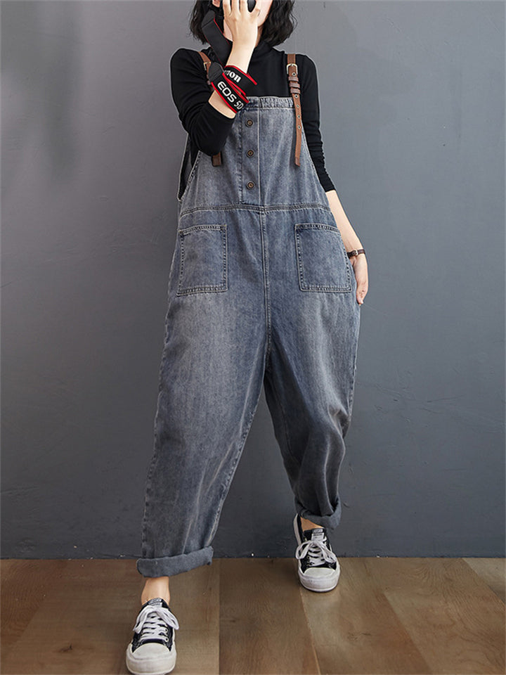 Women's Contrast Color Pockets Loose Overall Denim Jumpsuits