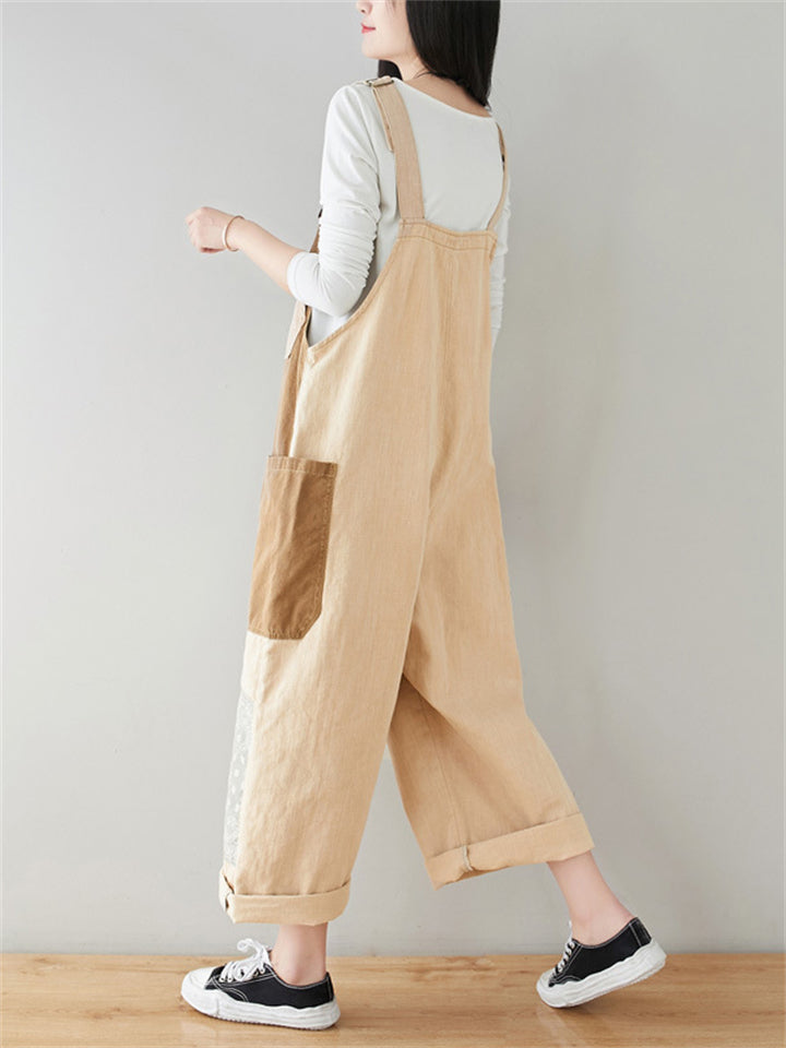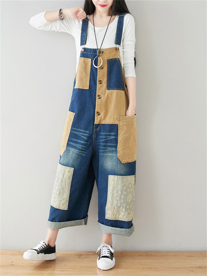 Women's Contrast Color Pockets Loose Overall Denim Jumpsuits