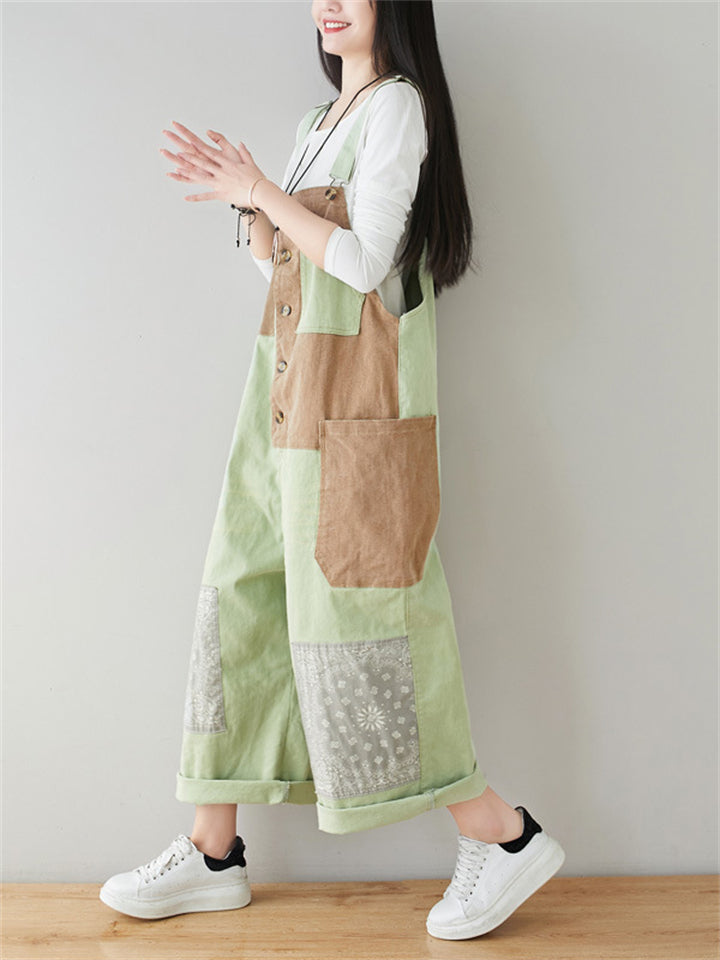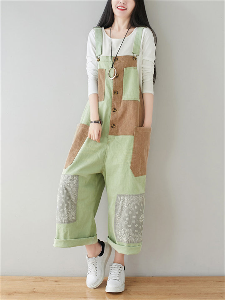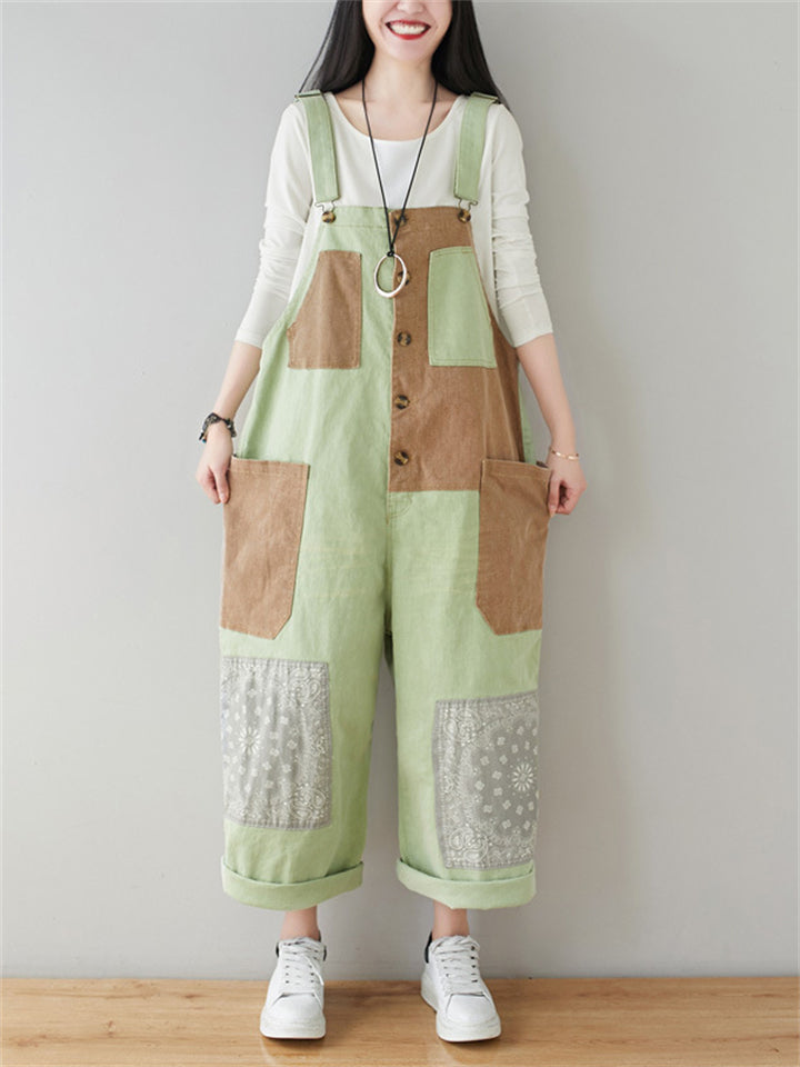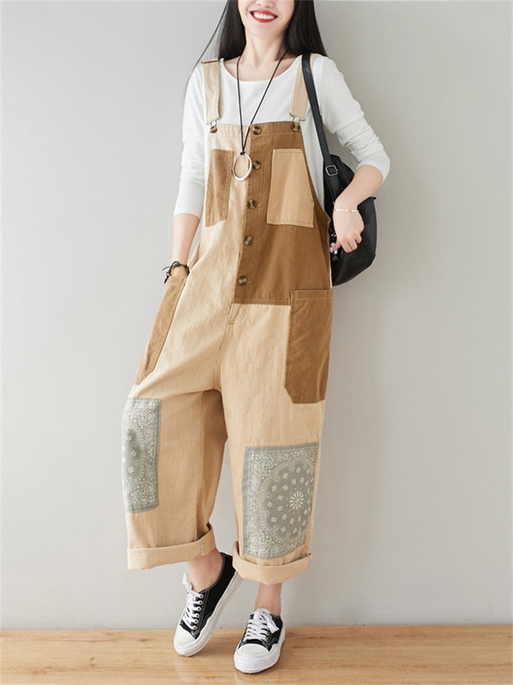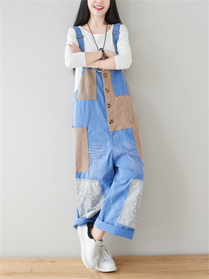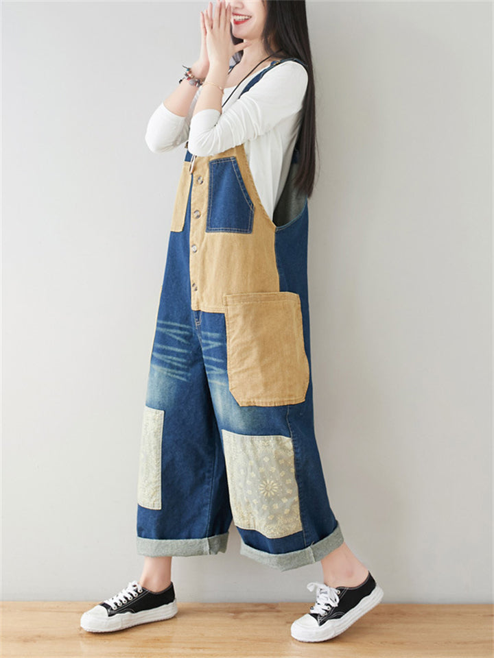 Women's Contrast Color Print Pockets Overall Denim Jumpsuits
