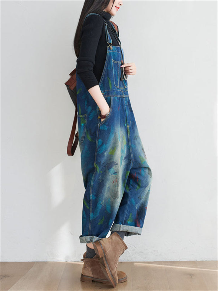 Retro Watercolor Pen Printed Denim Jumpsuits
