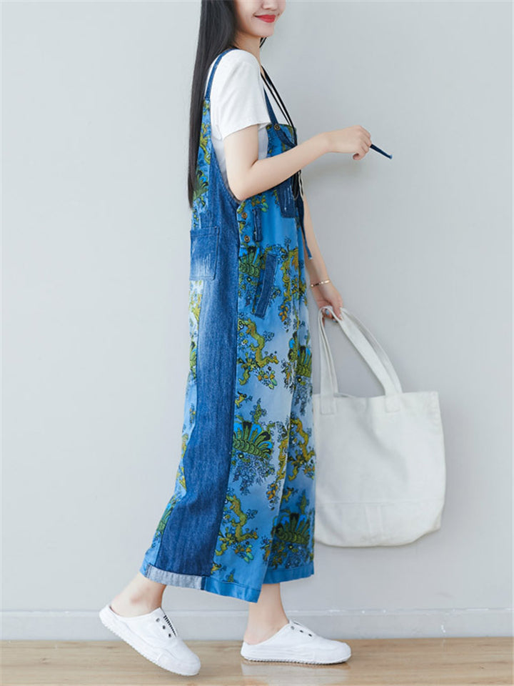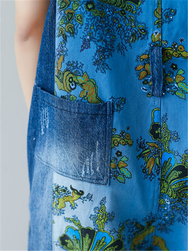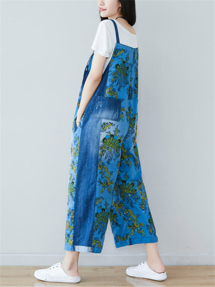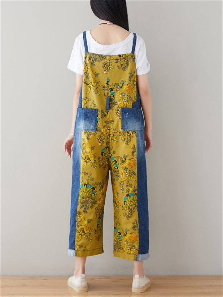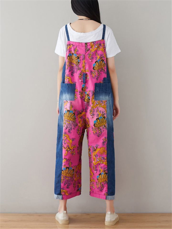 Women's Floral Print Contrast Color Overall Denim Jumpsuits