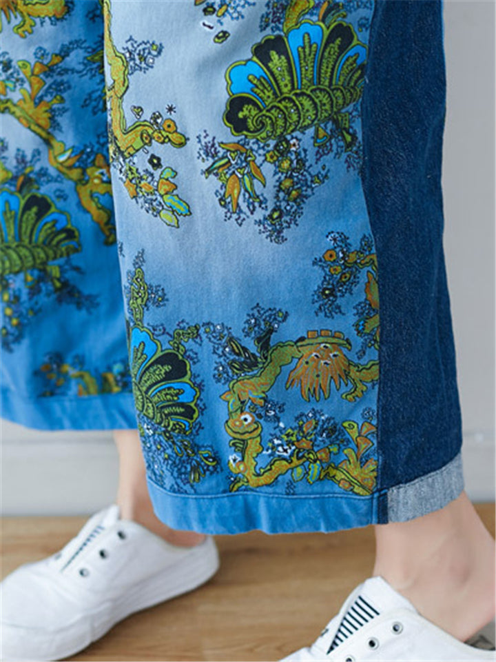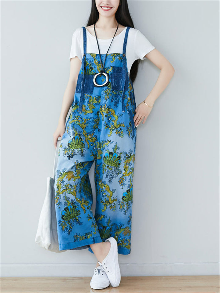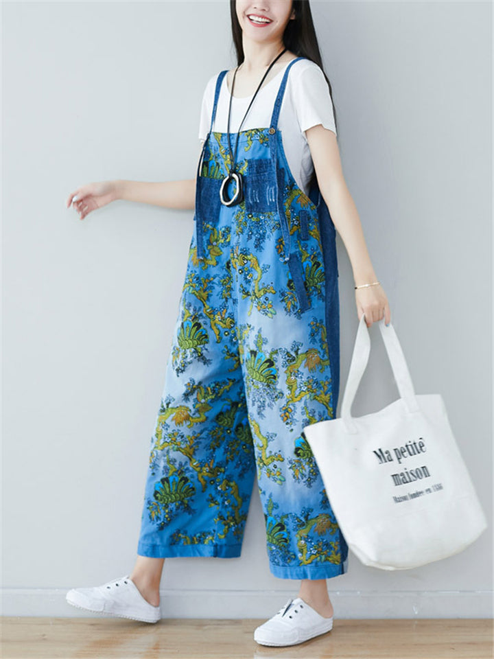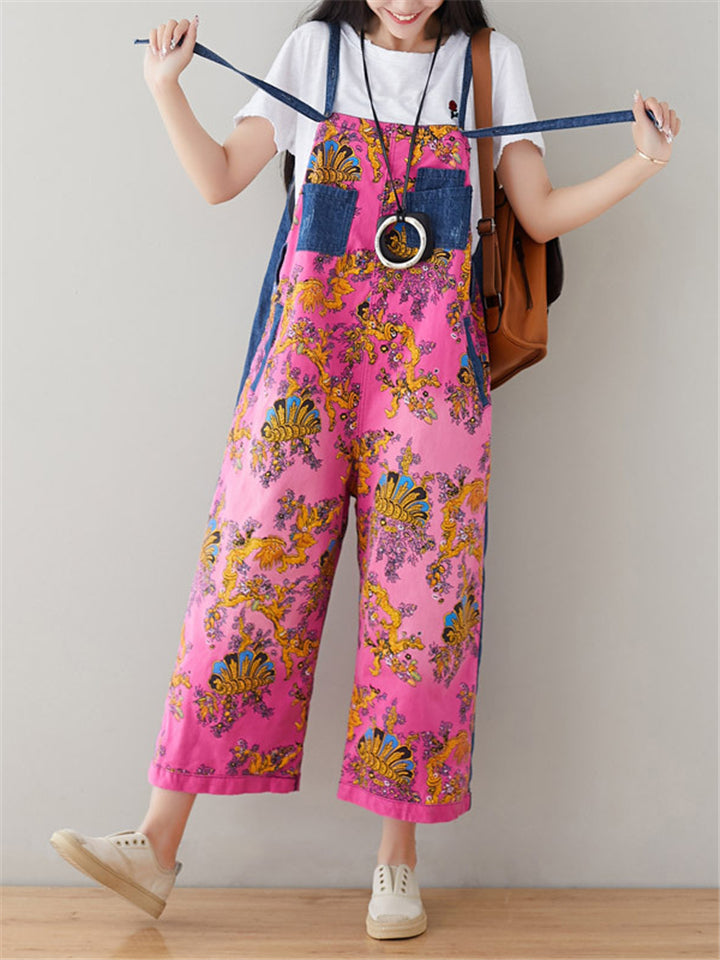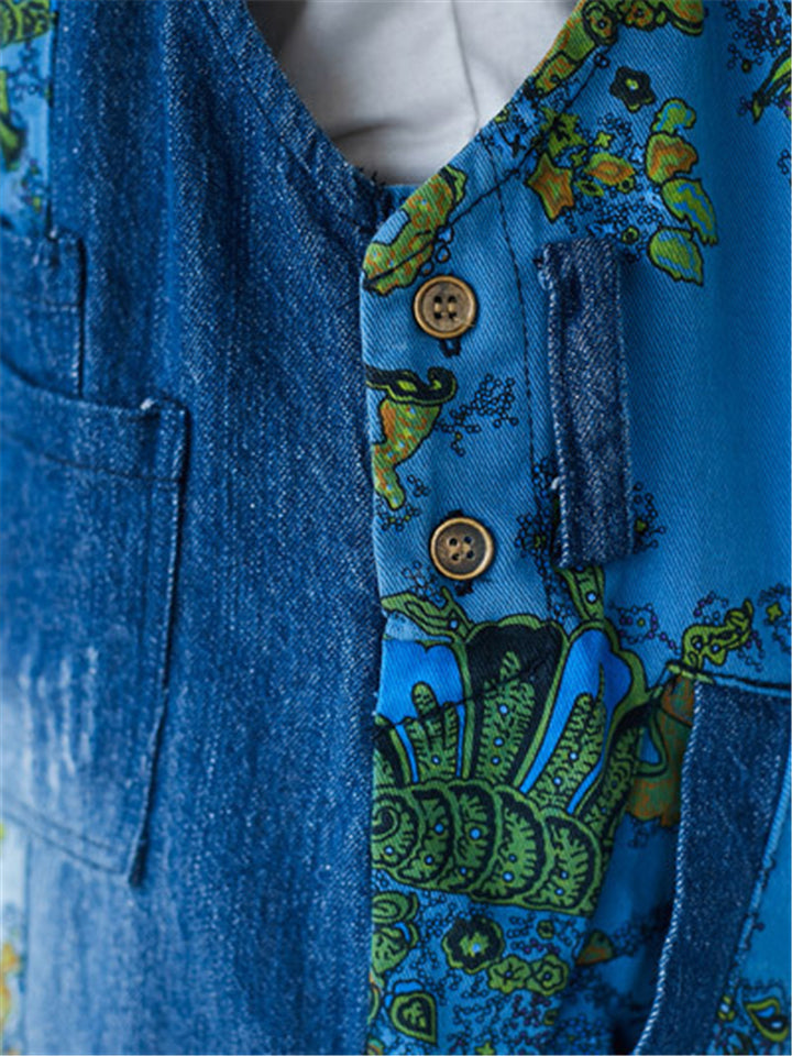 Women's Floral Print Contrast Color Overall Denim Jumpsuits
