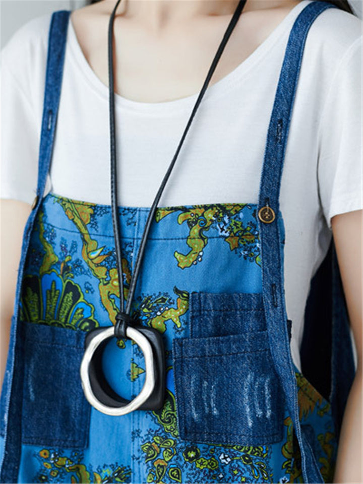 Women's Contrast Color Print Pockets Overall Denim Jumpsuits
