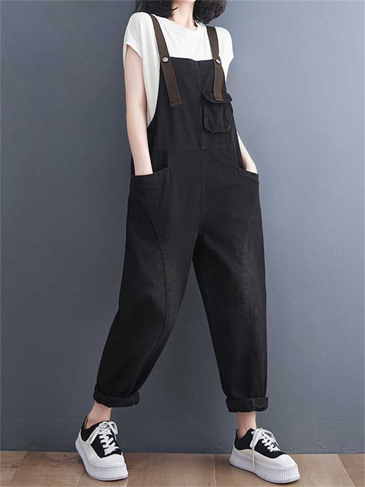 Women's Contrast Color Pockets Loose Overall Denim Jumpsuits