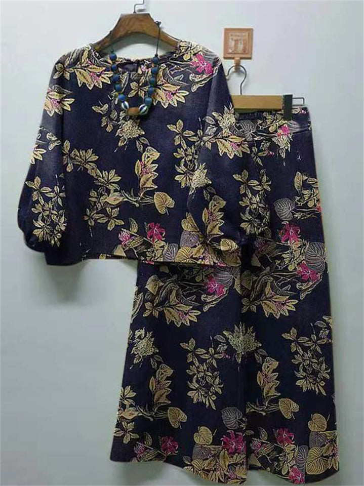 Women's 2pcs Casual Print Round Neck Top & Wide Leg Pants Set