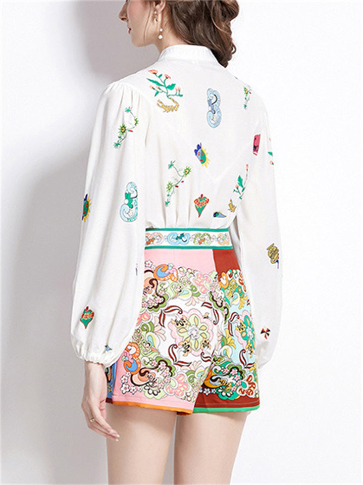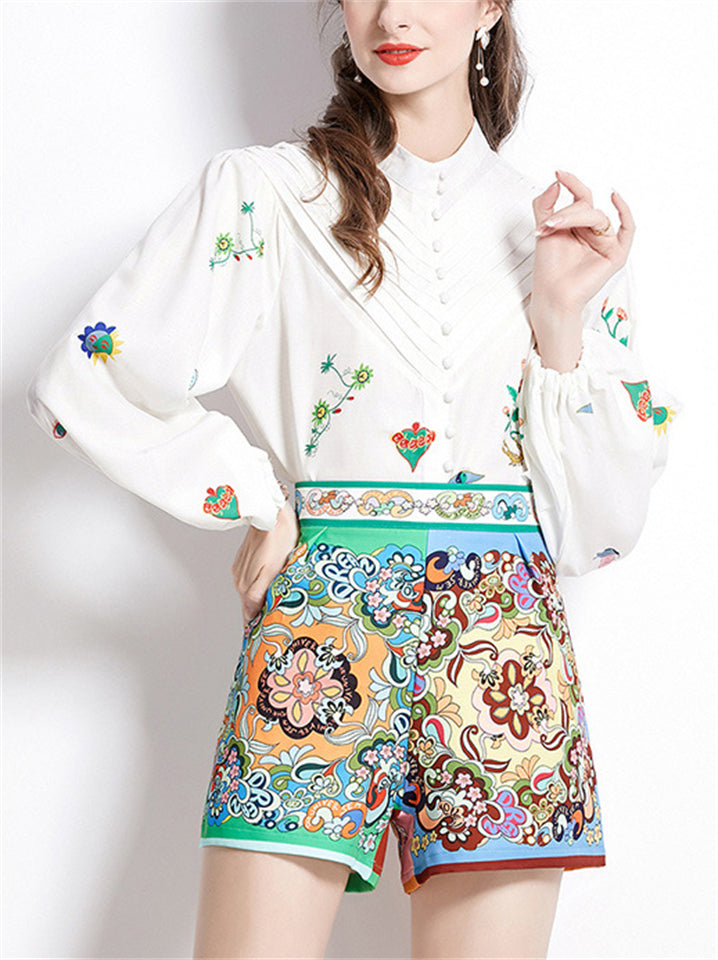 Women's 2Pcs Geometry Print Lapel Shirt & Skirt Set