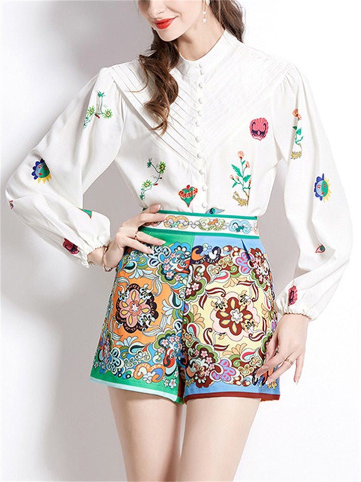 Women's 2Pcs Flowers Print Long Sleeve Shirt & Pants Set