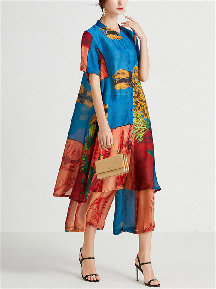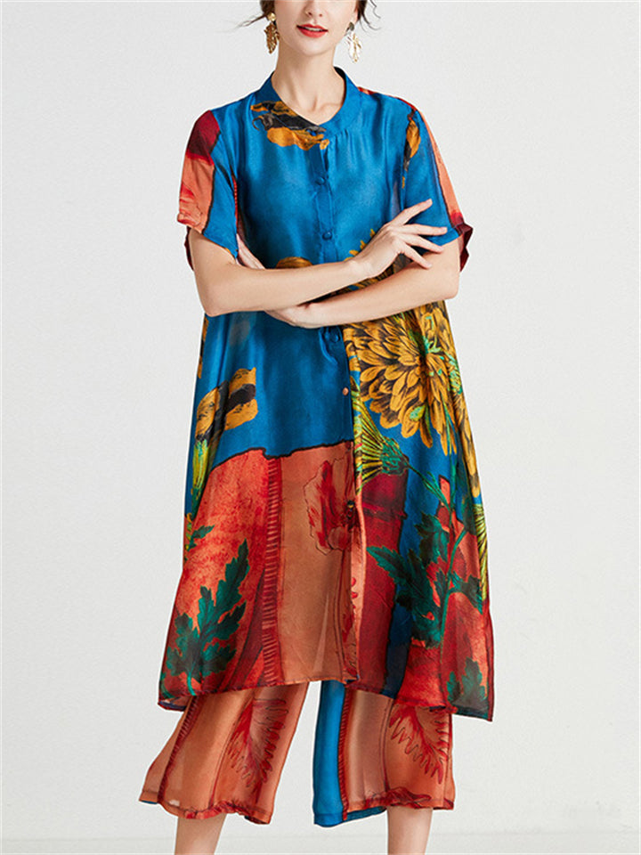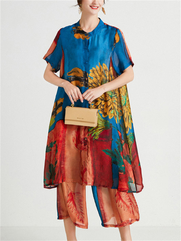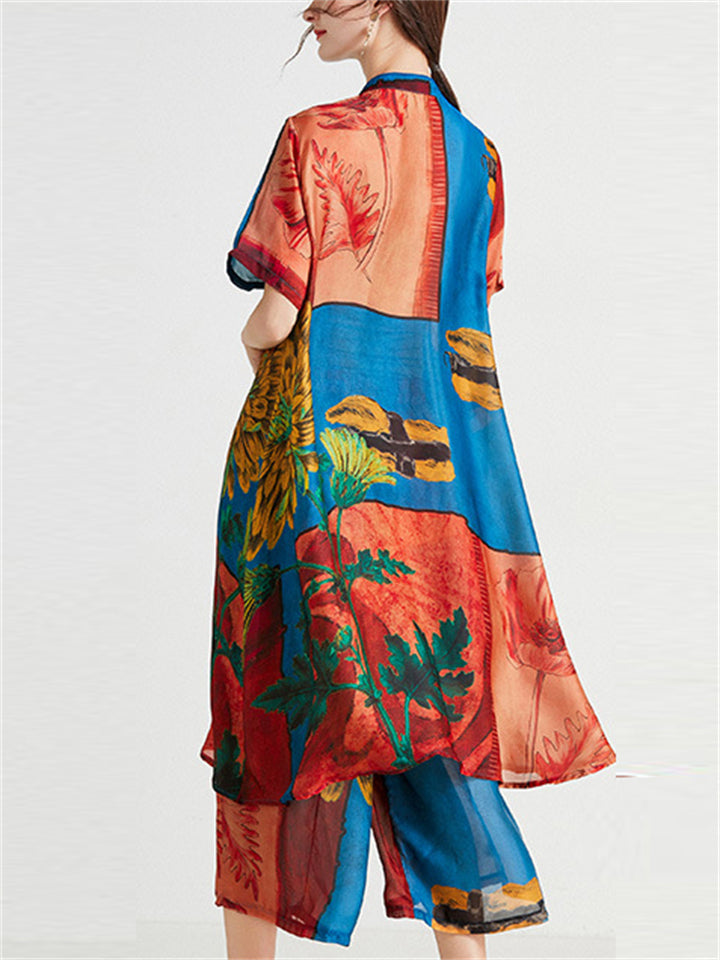 Women's 2Pcs Summer Flowers Print Lapel Satin Top & Pants