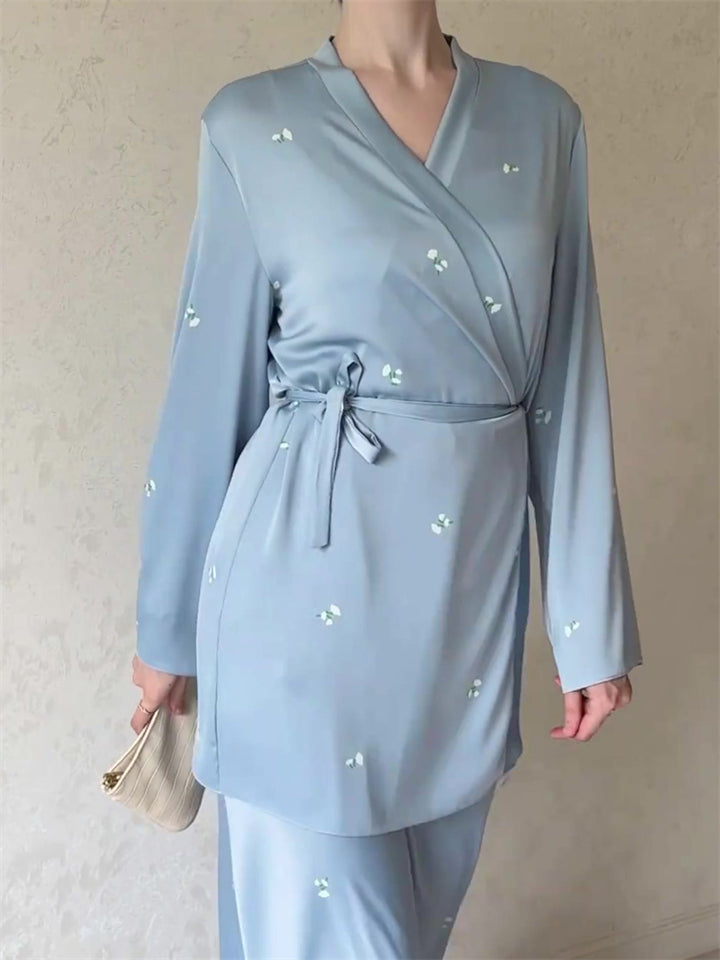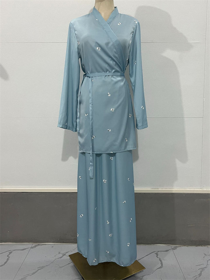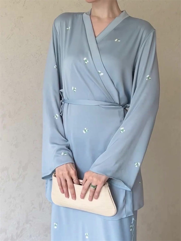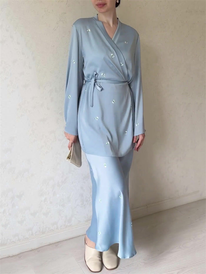 Women's Elegant Lace Up V Neck Blue Shirt + Flowy Skirt