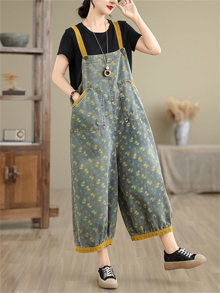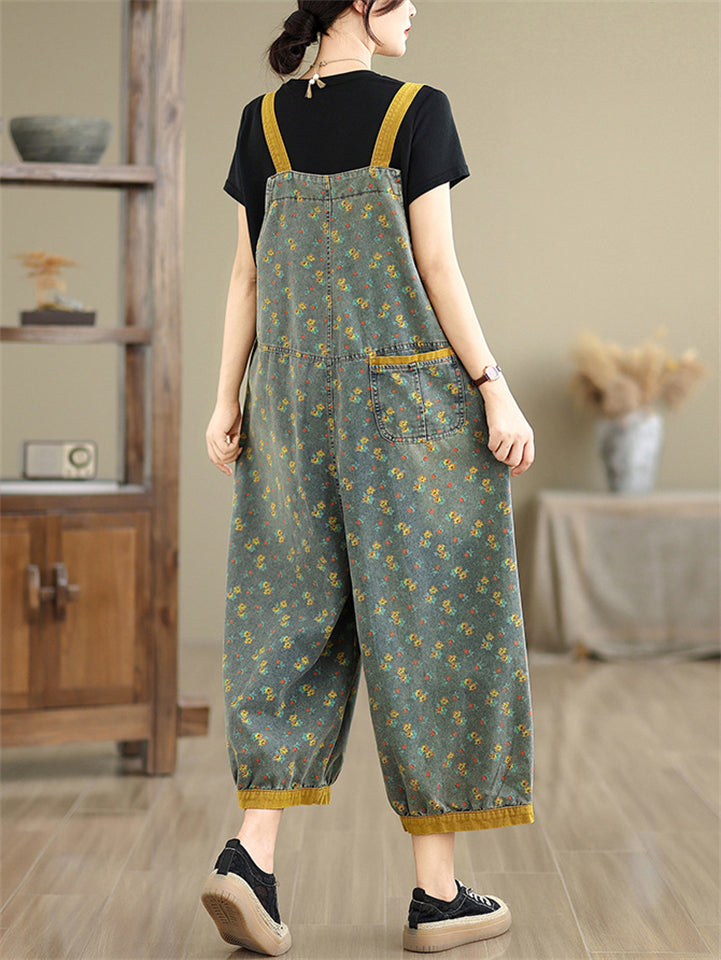 Women's Floral Print Contrast Color Overall Denim Jumpsuits