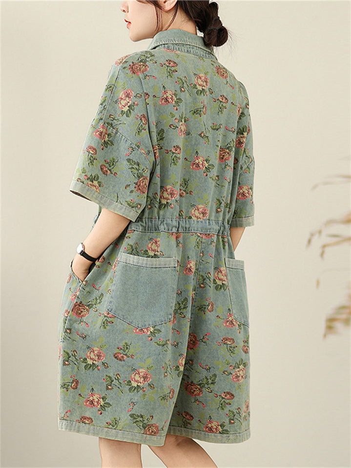 Women's Floral Print Pockets Overall Short Sleeve Denim Jumpsuits