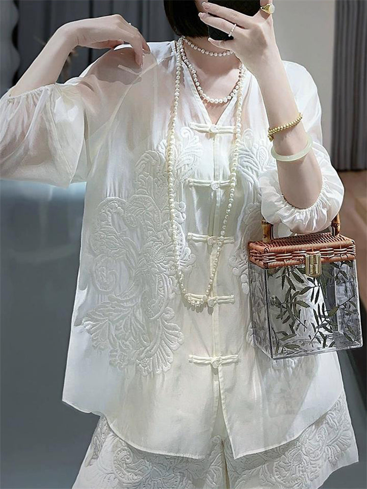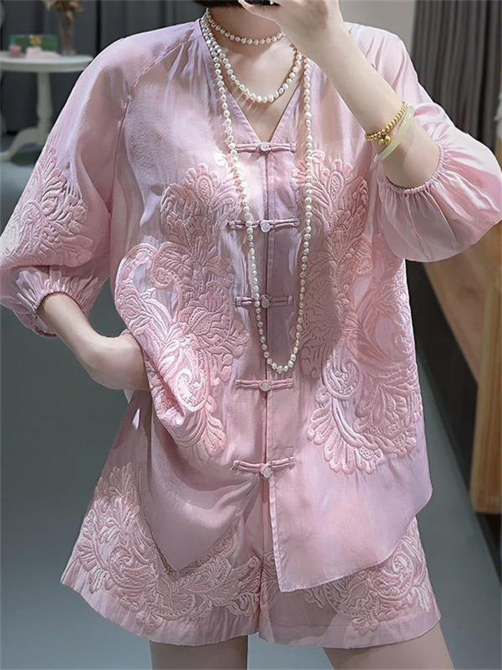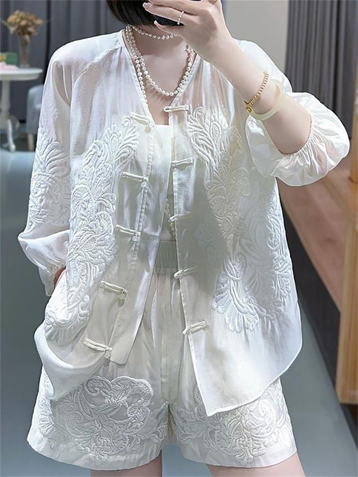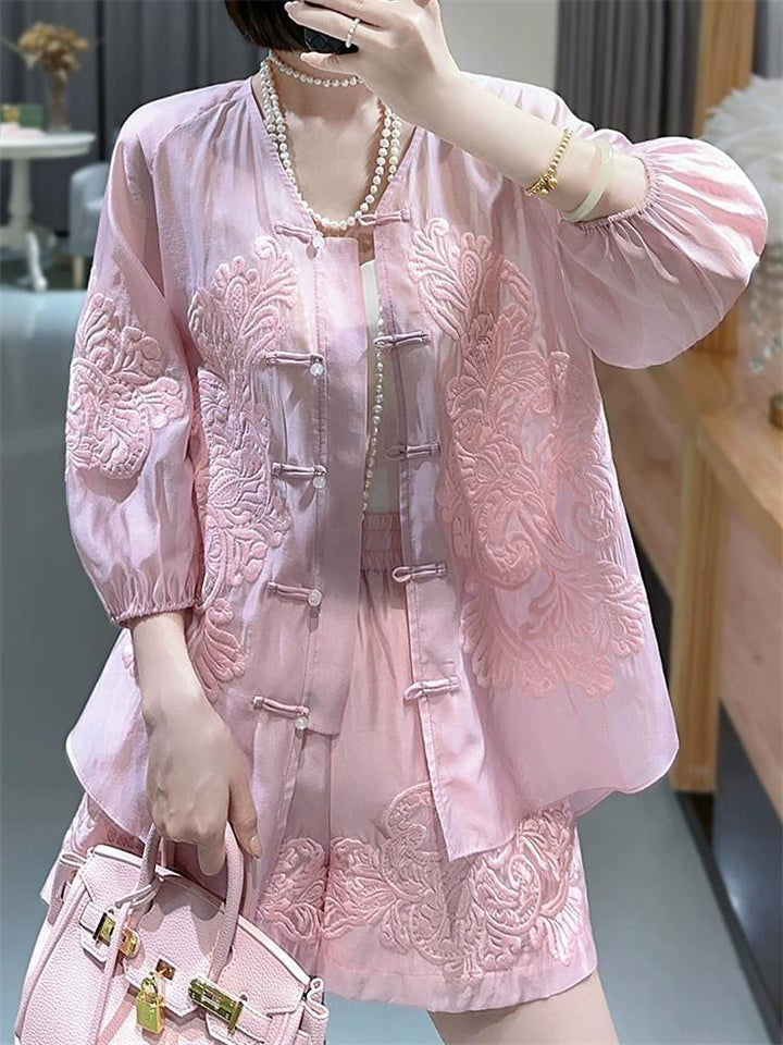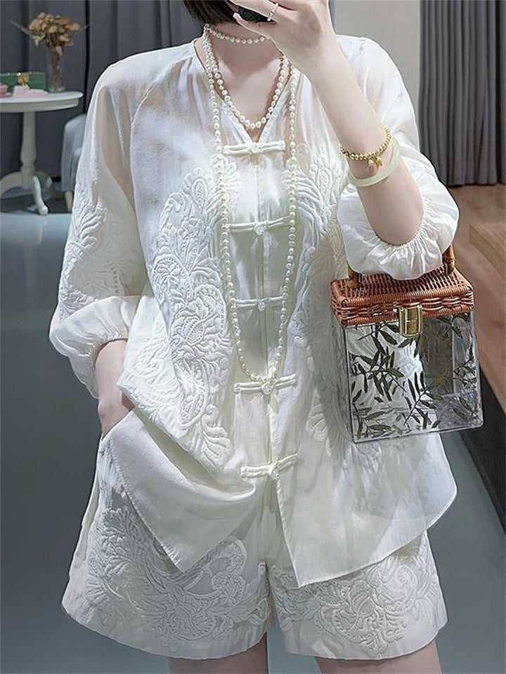 Women's Flower Embroidered Top + Shorts Chinese Style Tang Suit Set