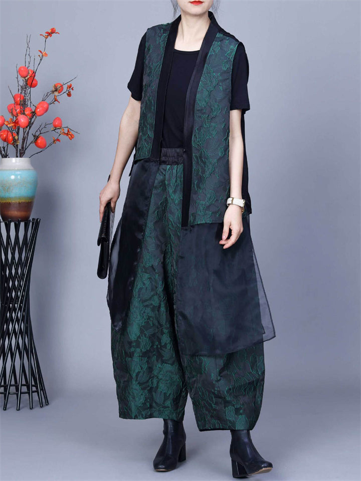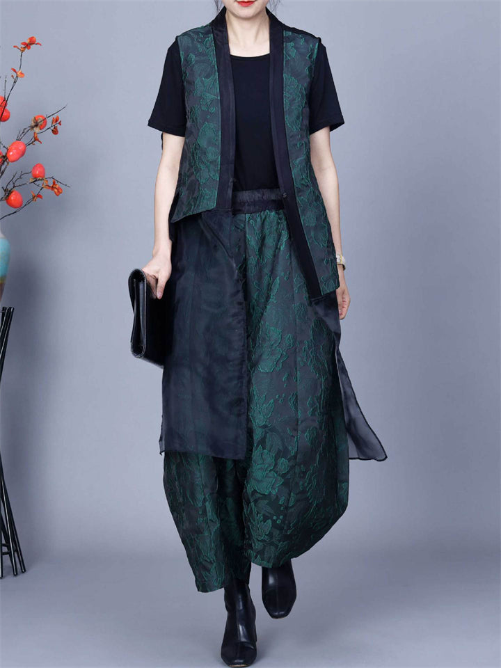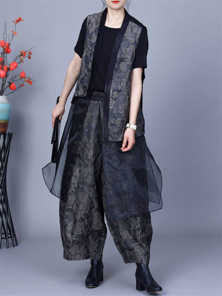 Women's 2Pcs Chinese Style Print Lapel Denim Top & Pants Set