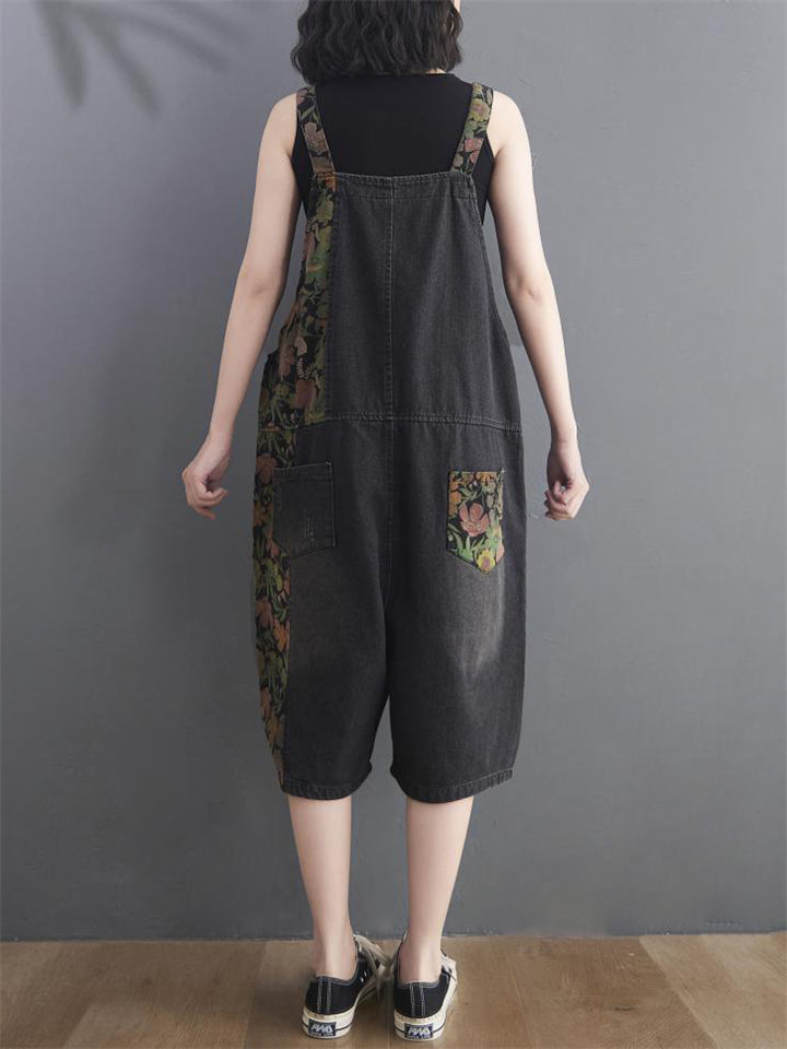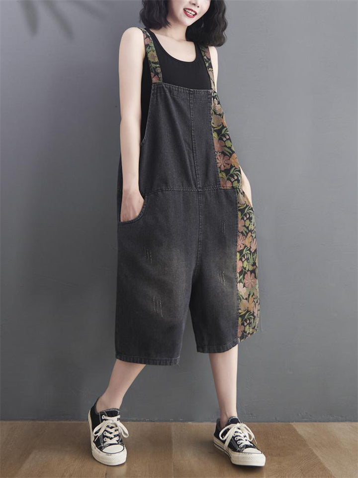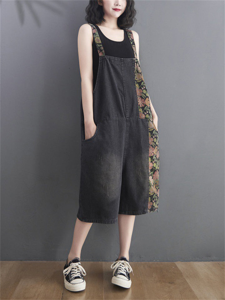 Women's Floral Print Contrast Color Overall Denim Jumpsuits