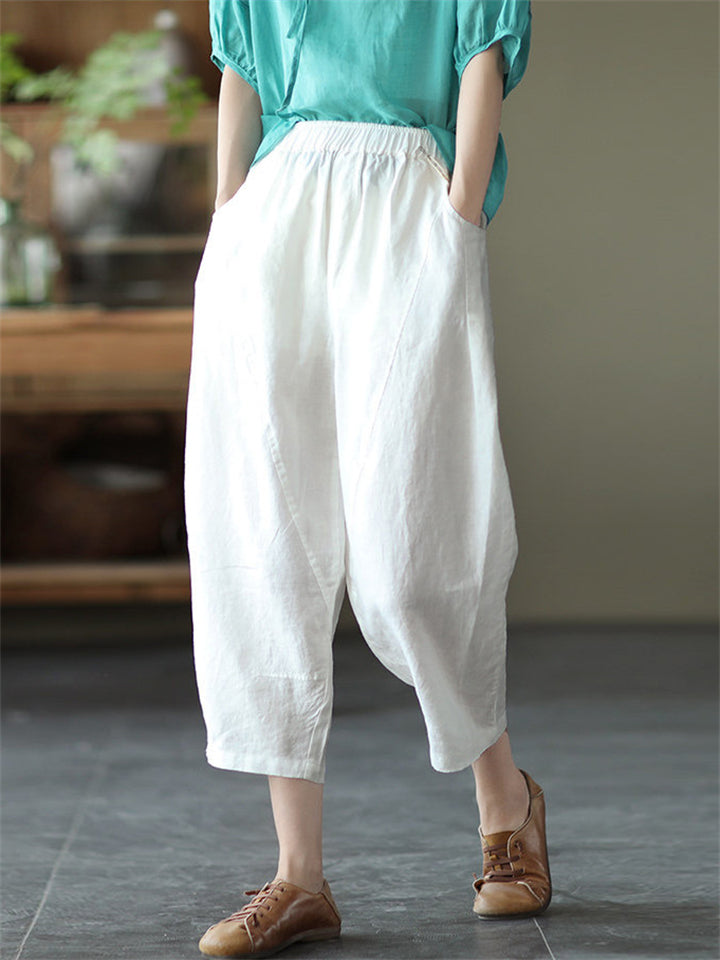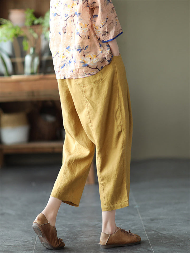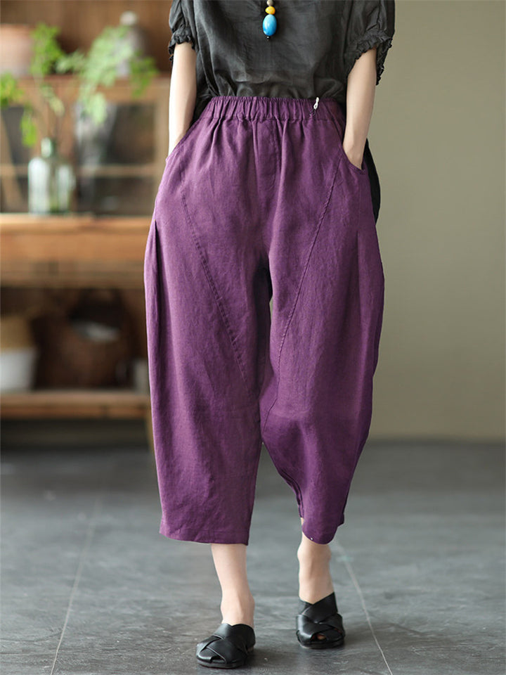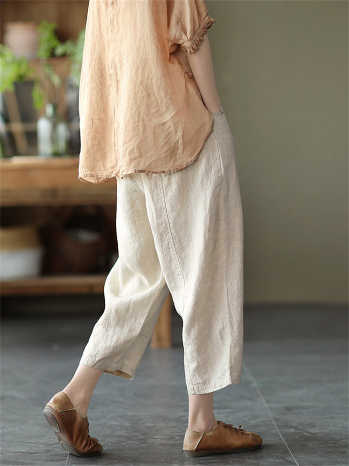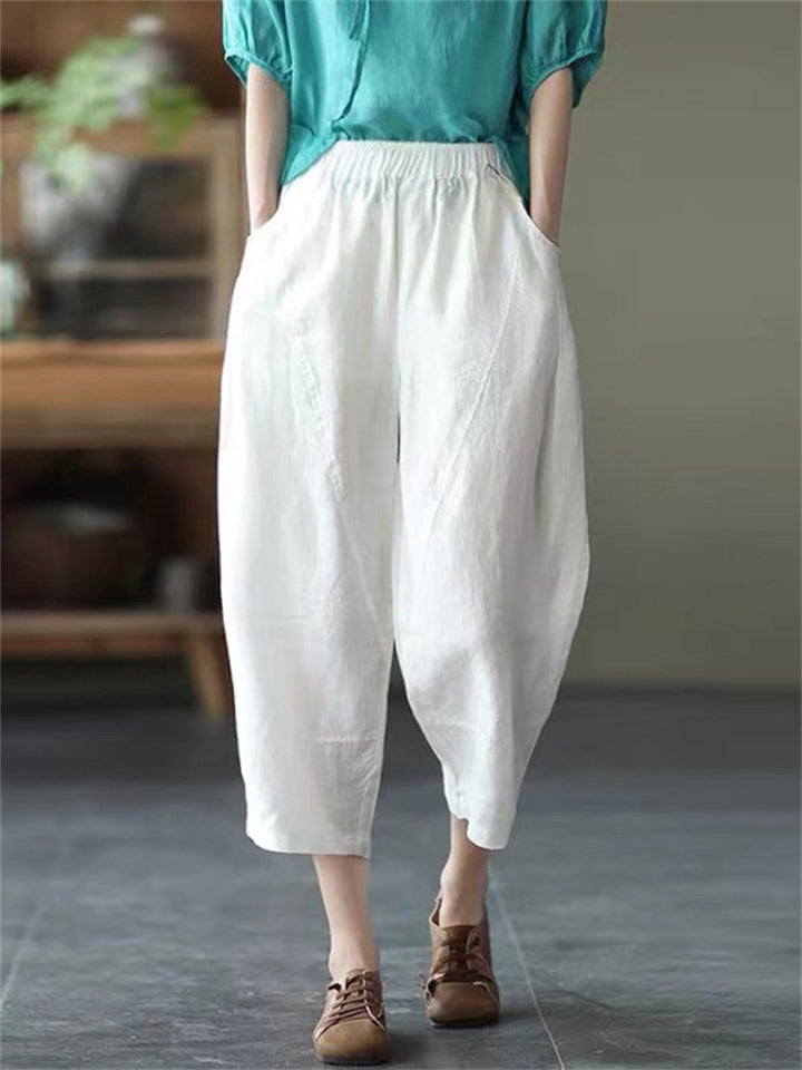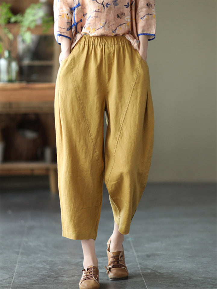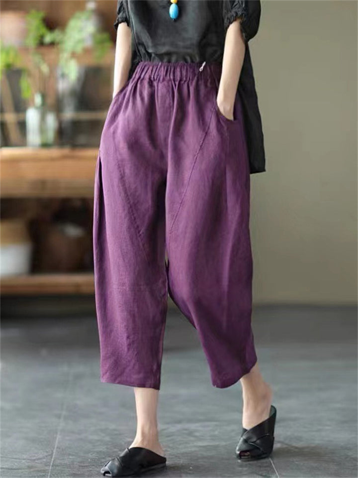 Cotton Linen Elastic Waist Solid Patchwork Women's Pants
