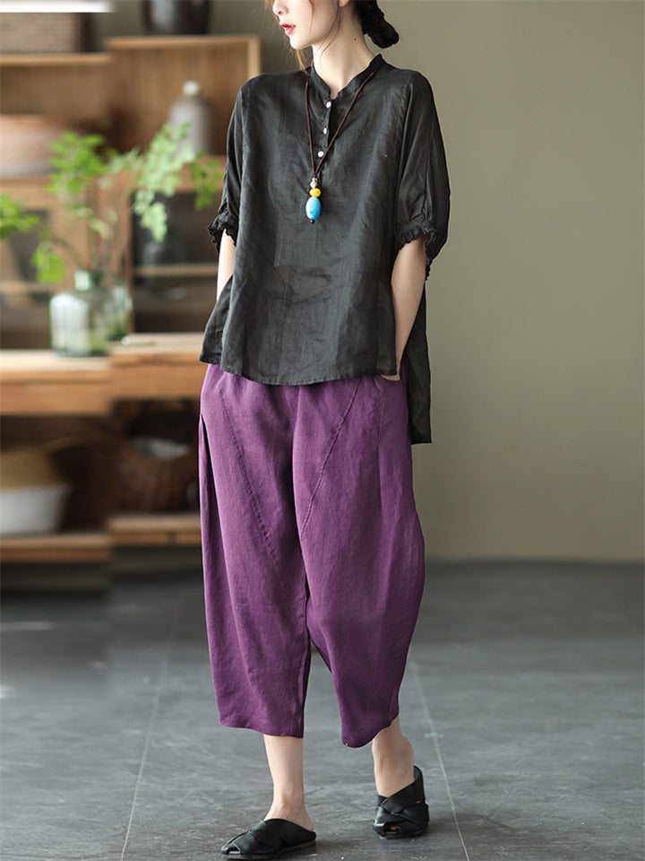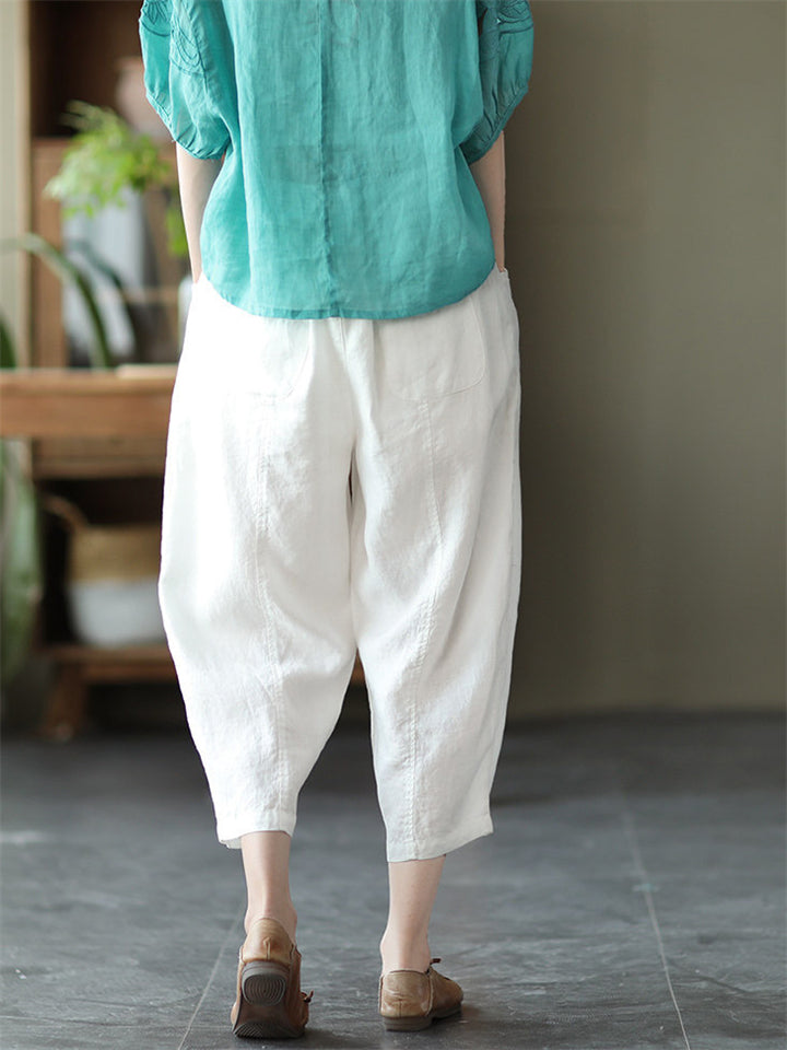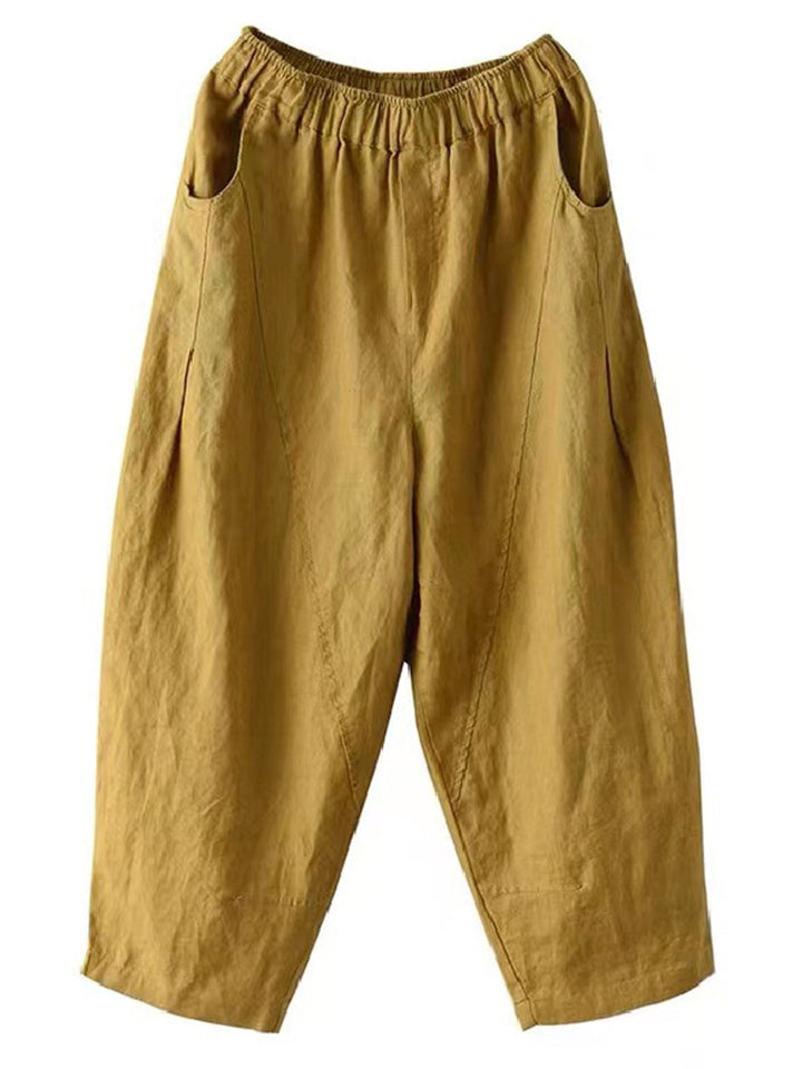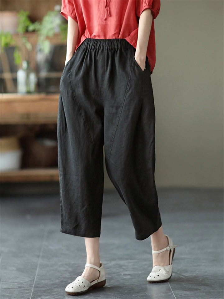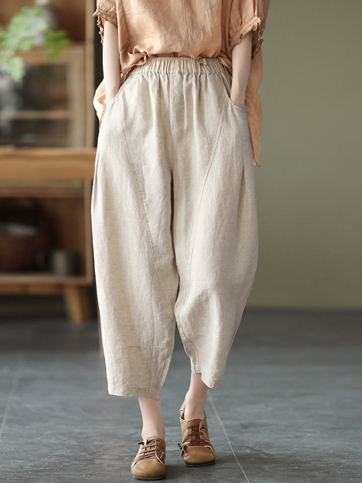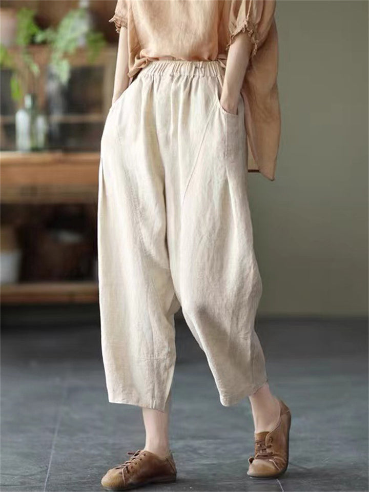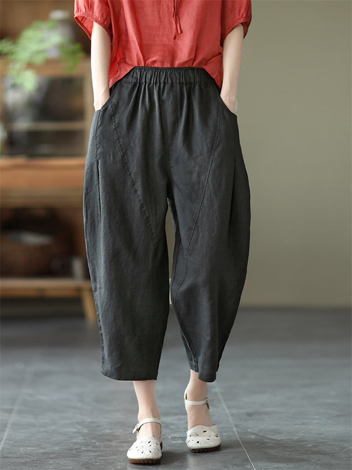 Cotton Linen Elastic Waist Solid Patchwork Women's Pants