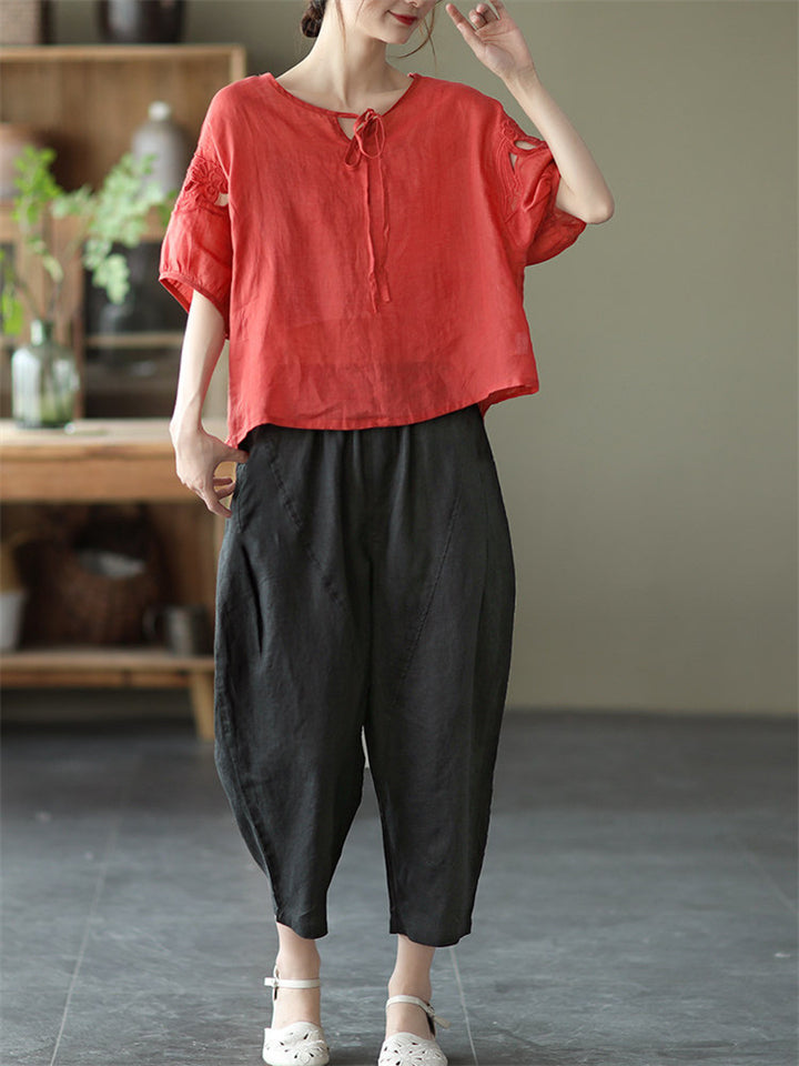 Women's Embossed Jacquard Tie-Waist Wide Leg Cropped Bloomers Pants