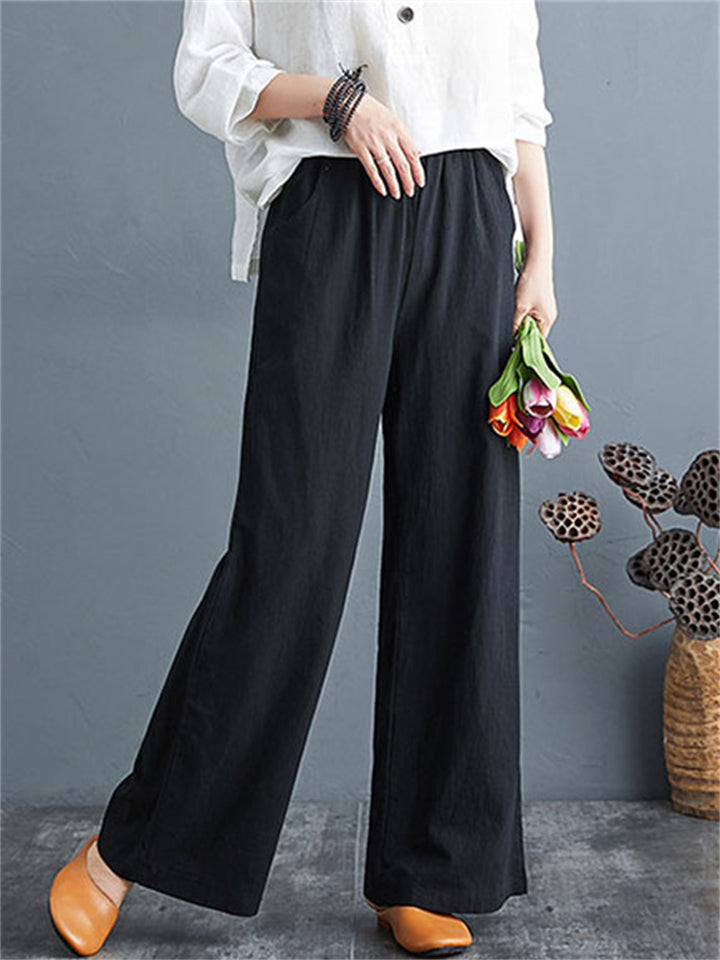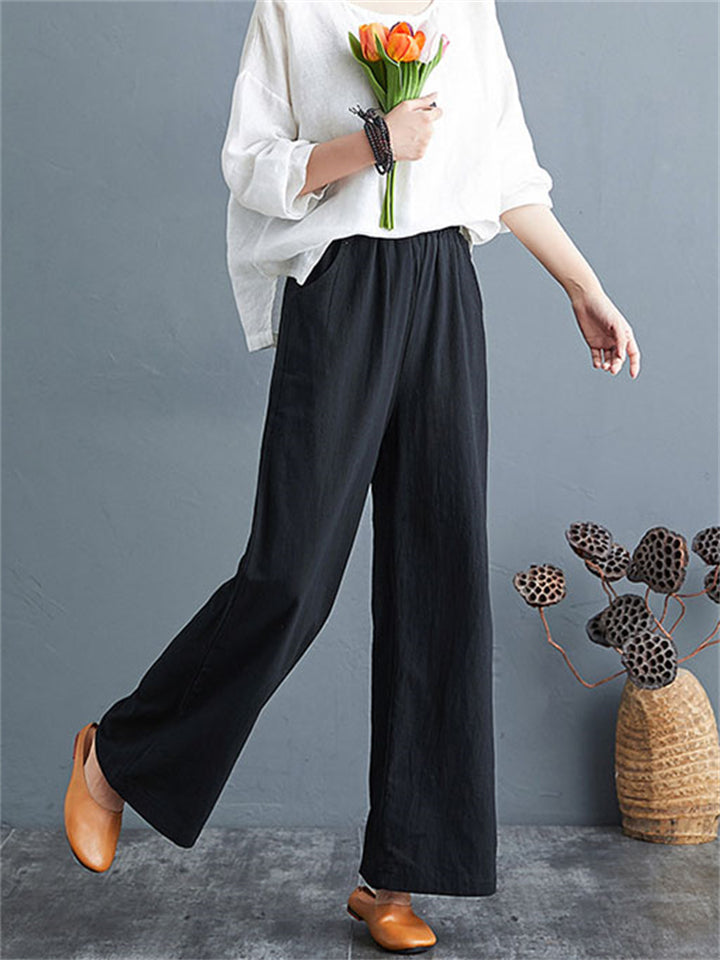 Women's Ethnic Style Embroidery Solid Color Elastic Waist Wide Leg Pants