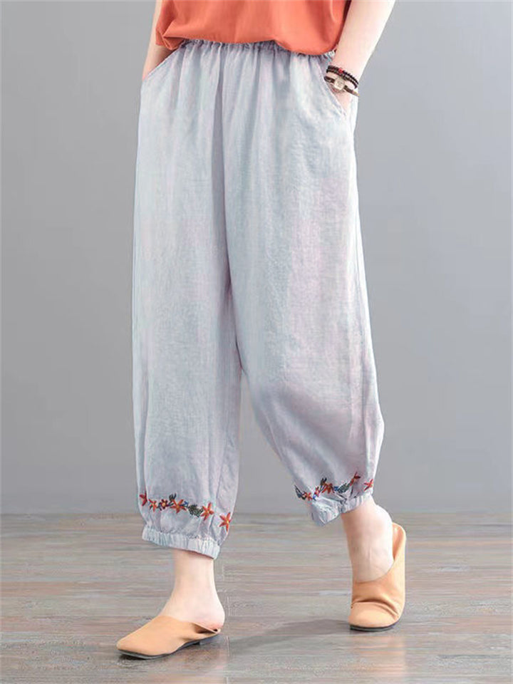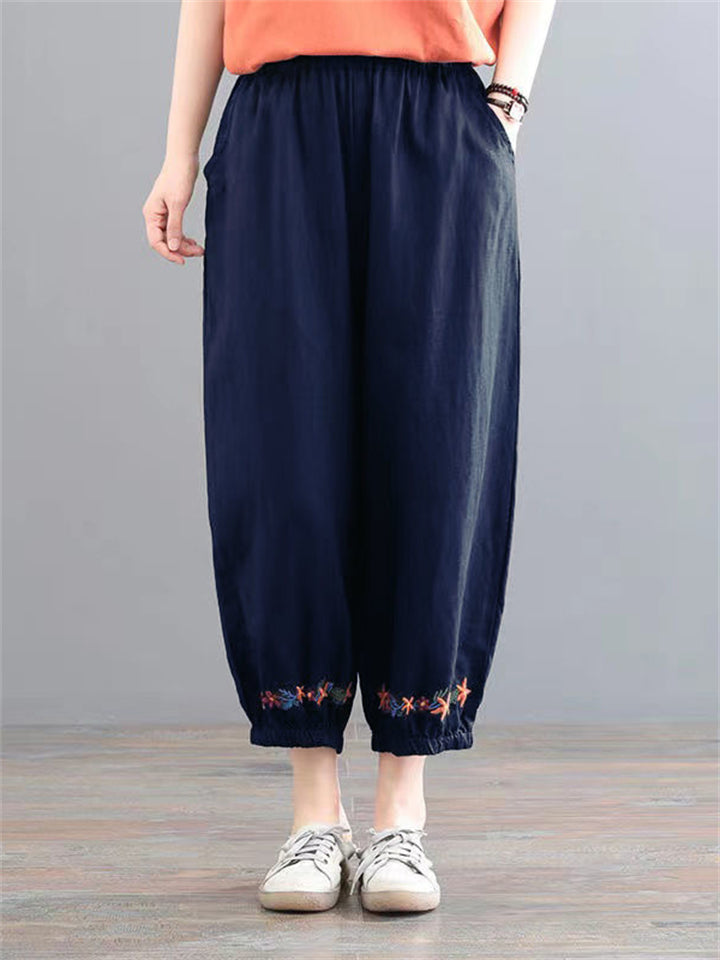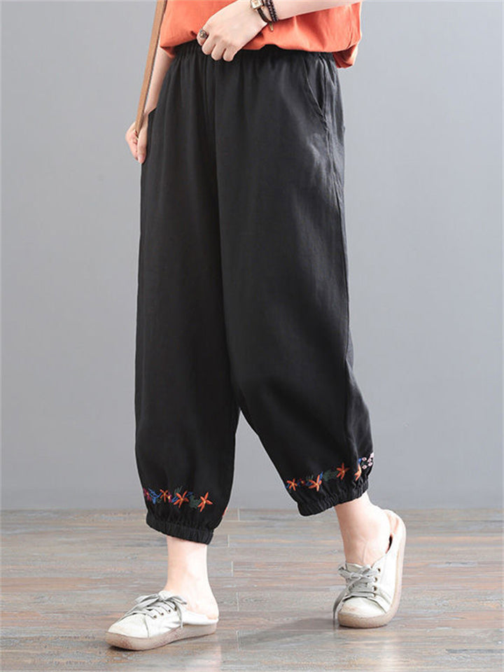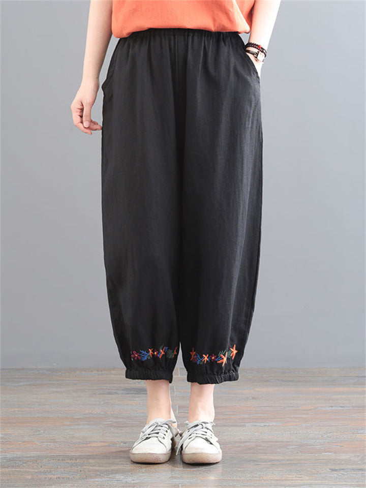 Women's Ethnic Style Floral Embroidered Elastic Waist Bloomers Pants