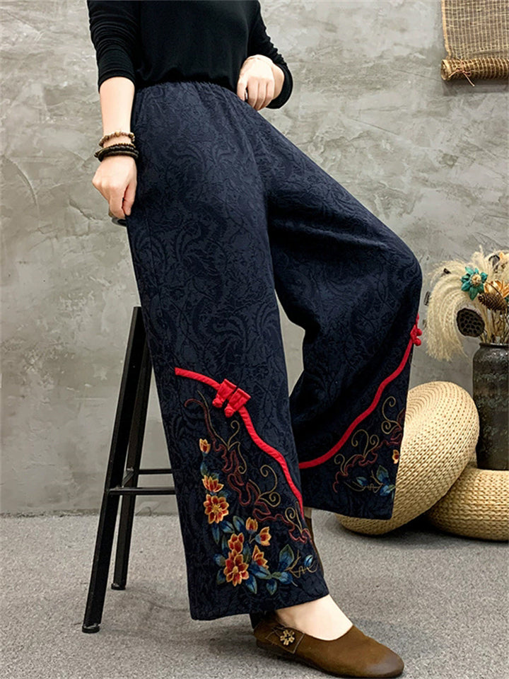 Women's Ethnic Style Floral Embroidered Frog Button Decor Wide Leg Pants