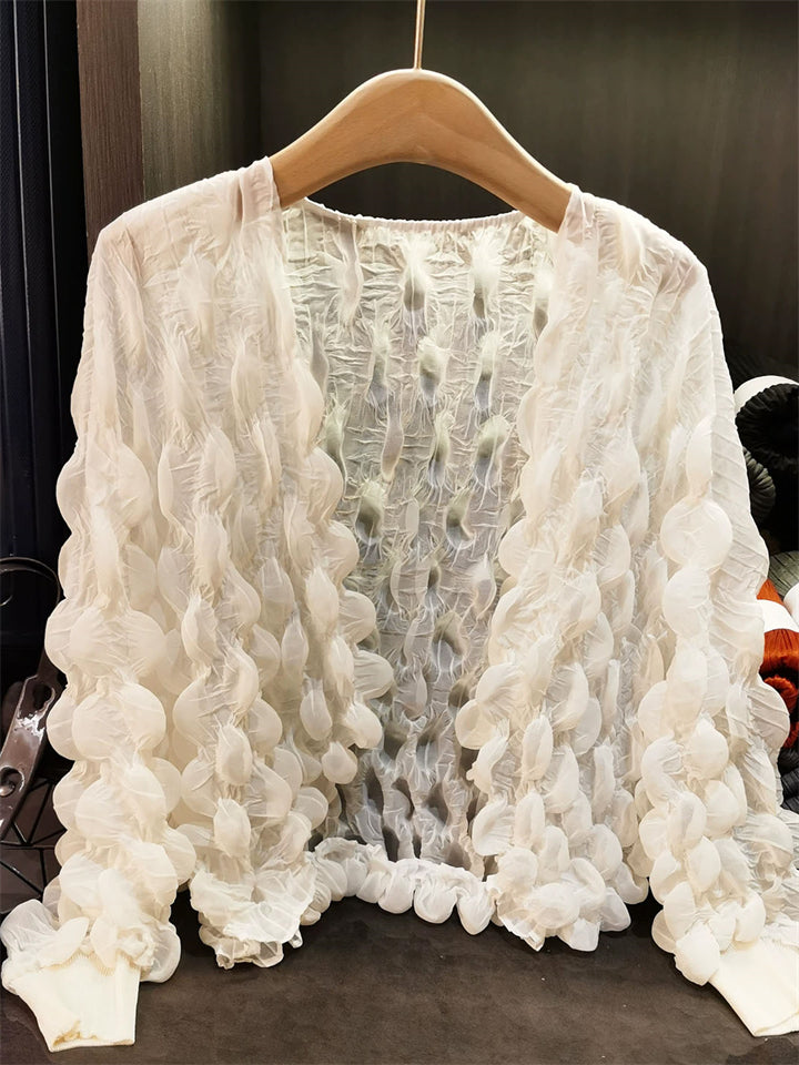 Women's Bubble Design Pleated Ruffled Sleeve Cardigan Shirts
