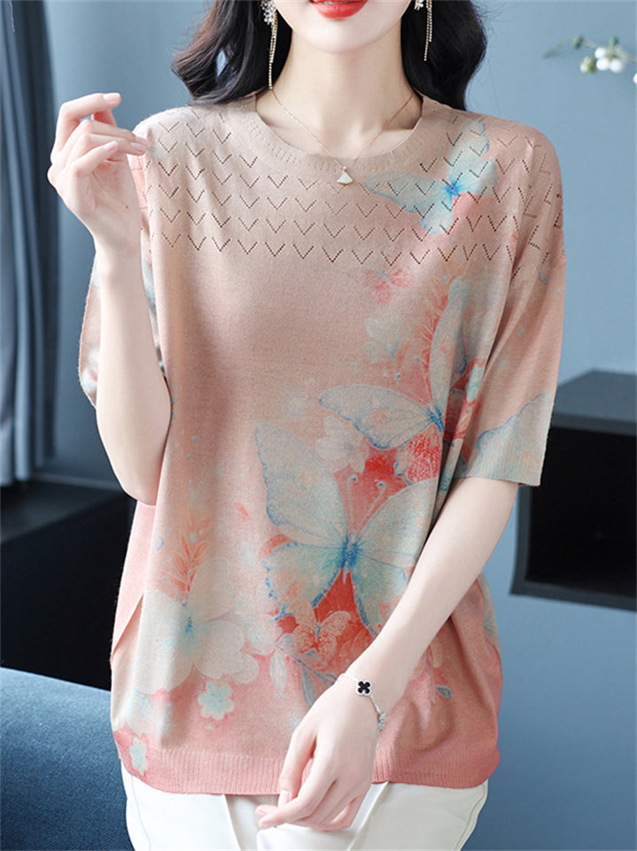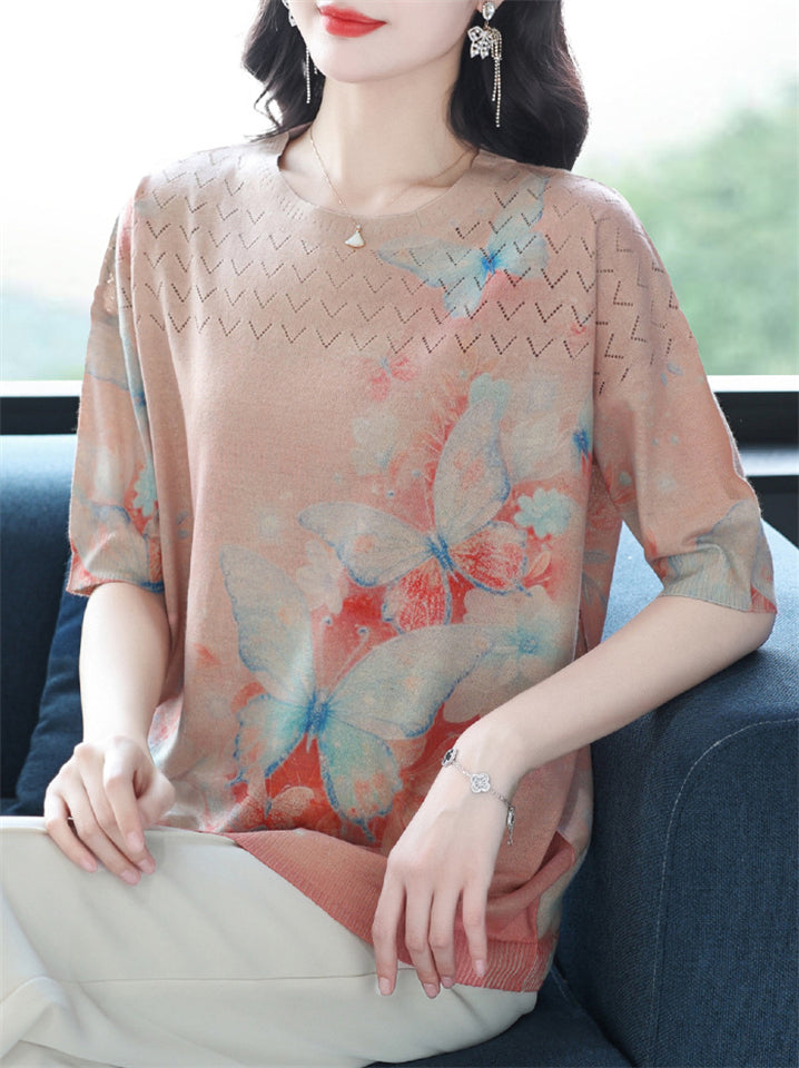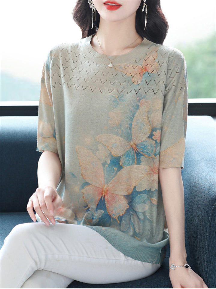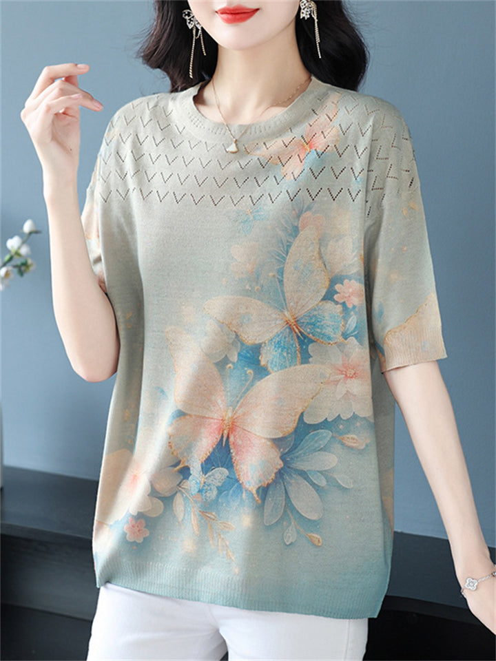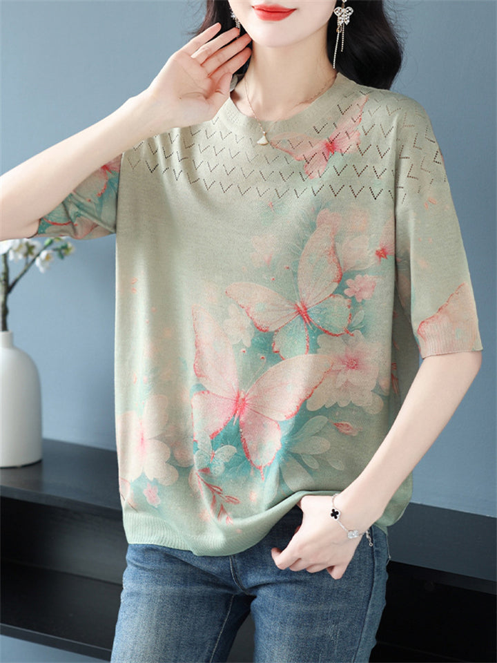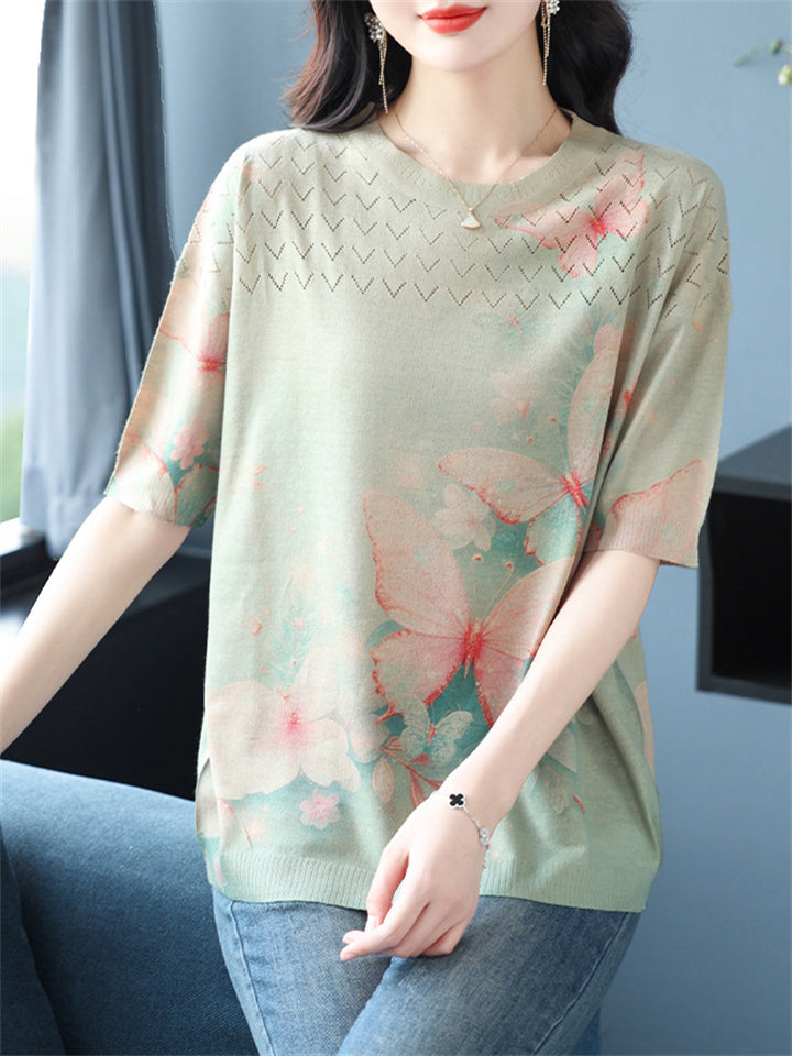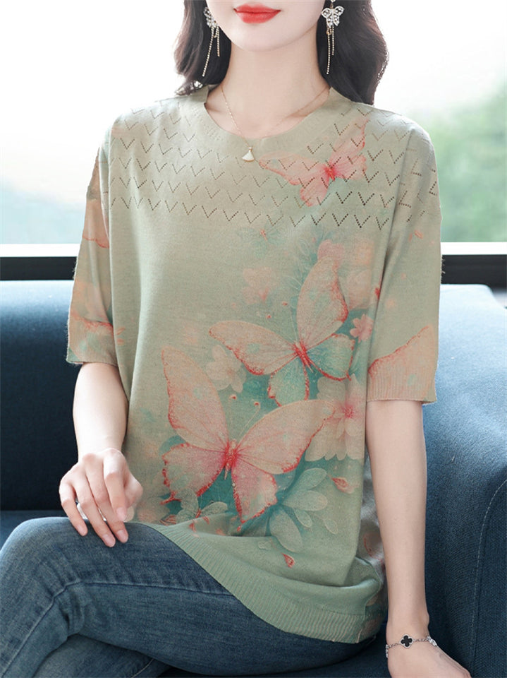 Casual Women's Loose Butterfly Print Short Sleeve Knit T-Shirts