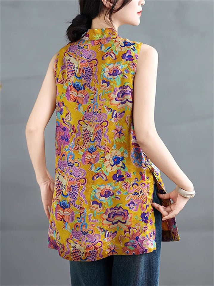 Chinese Style Comfy Yellow Vintage Summer Printed Vest Shirt