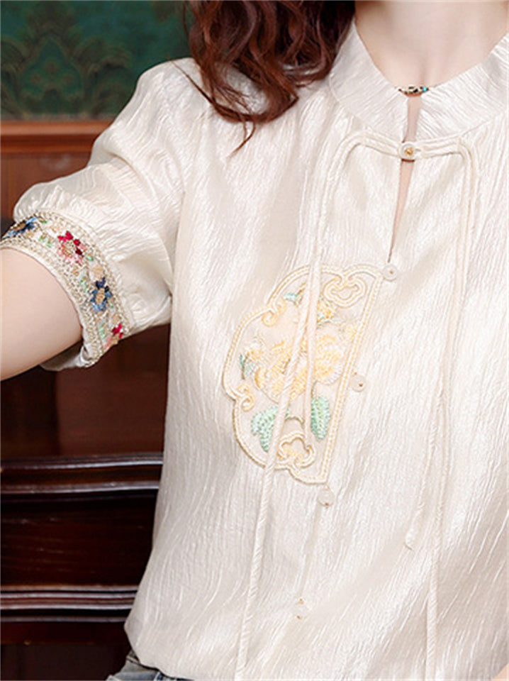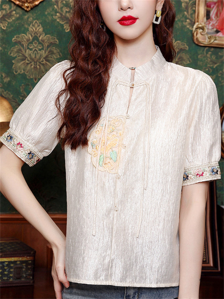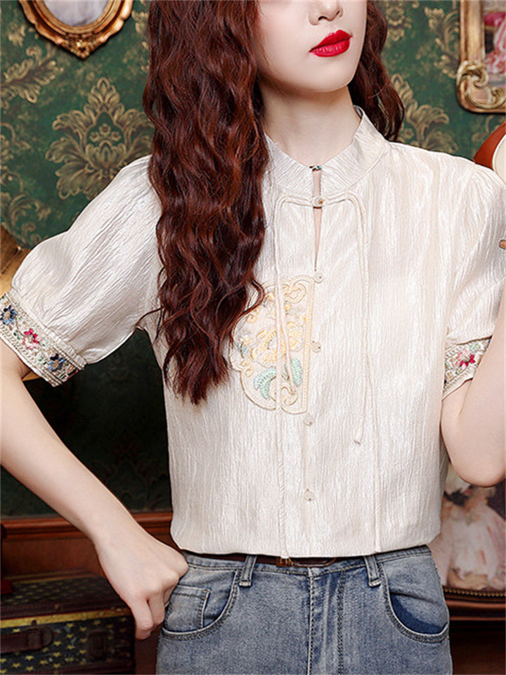 Chinese Style Elegant Embroidery Stand Collar Short Sleeve Shirt for Women
