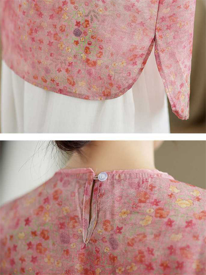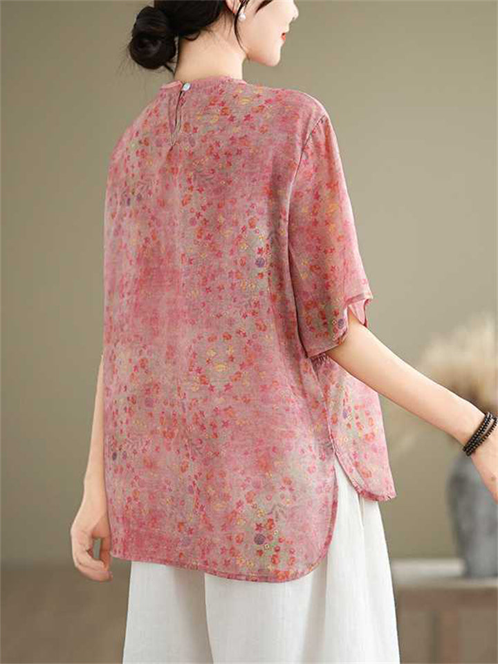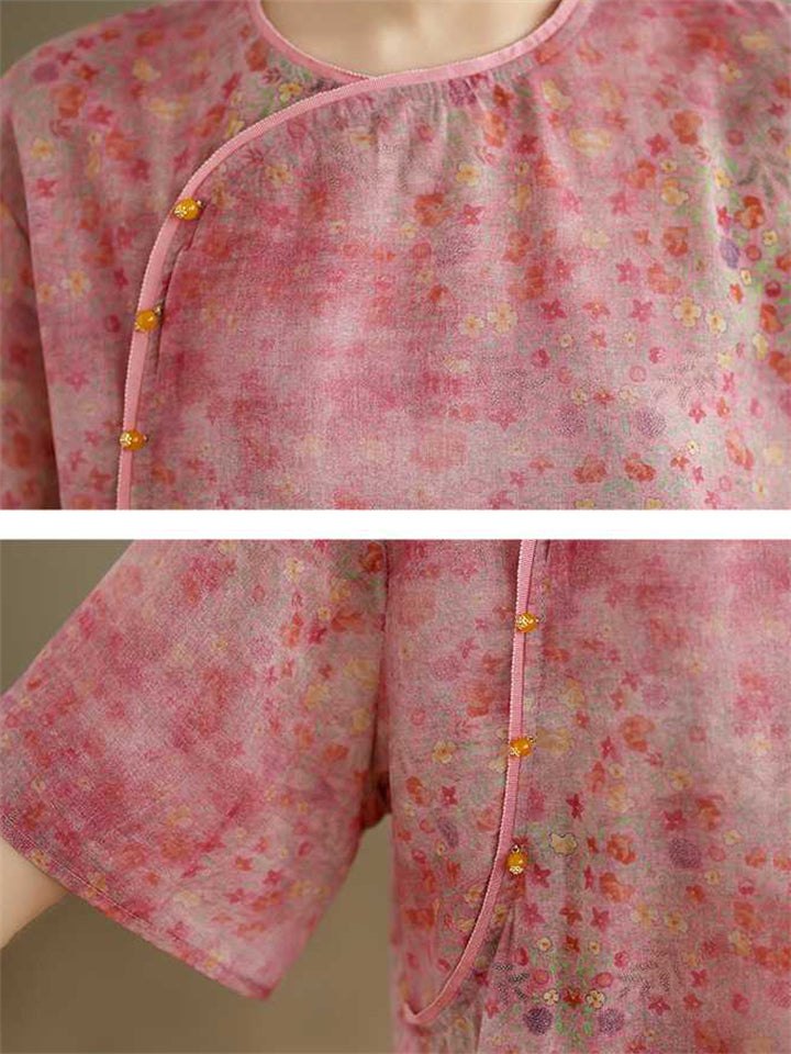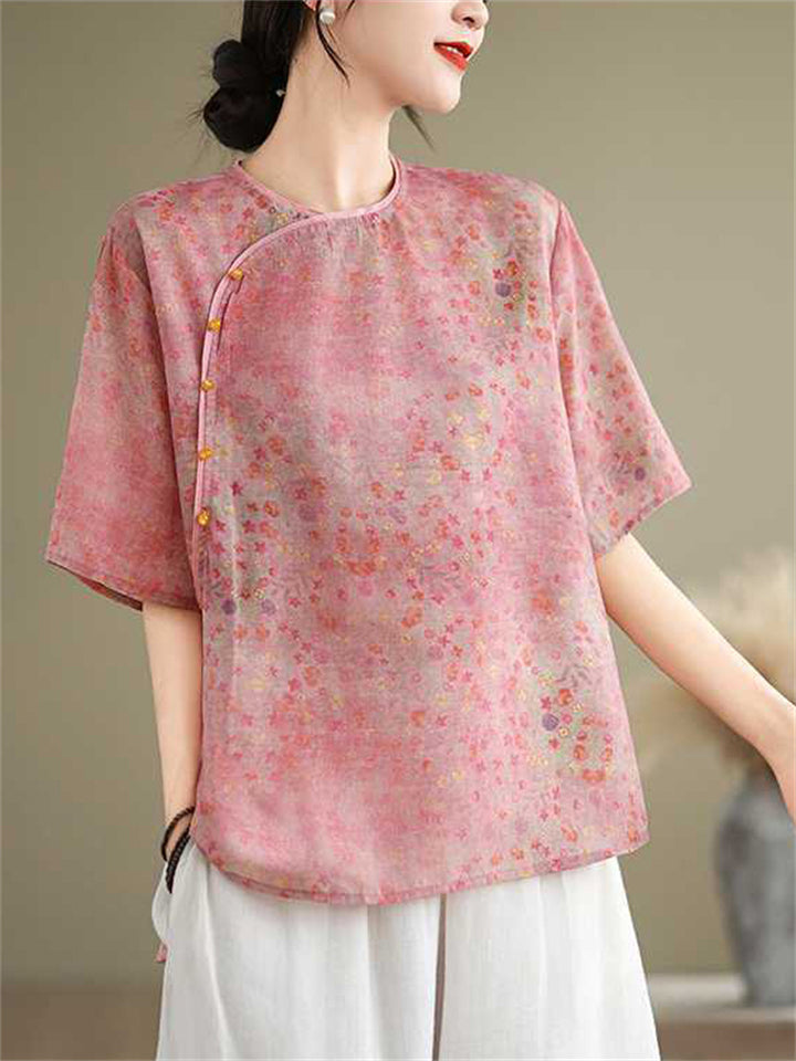 Chinese Style Linen Floral Print Round Neck Shirt for Lady