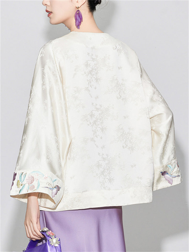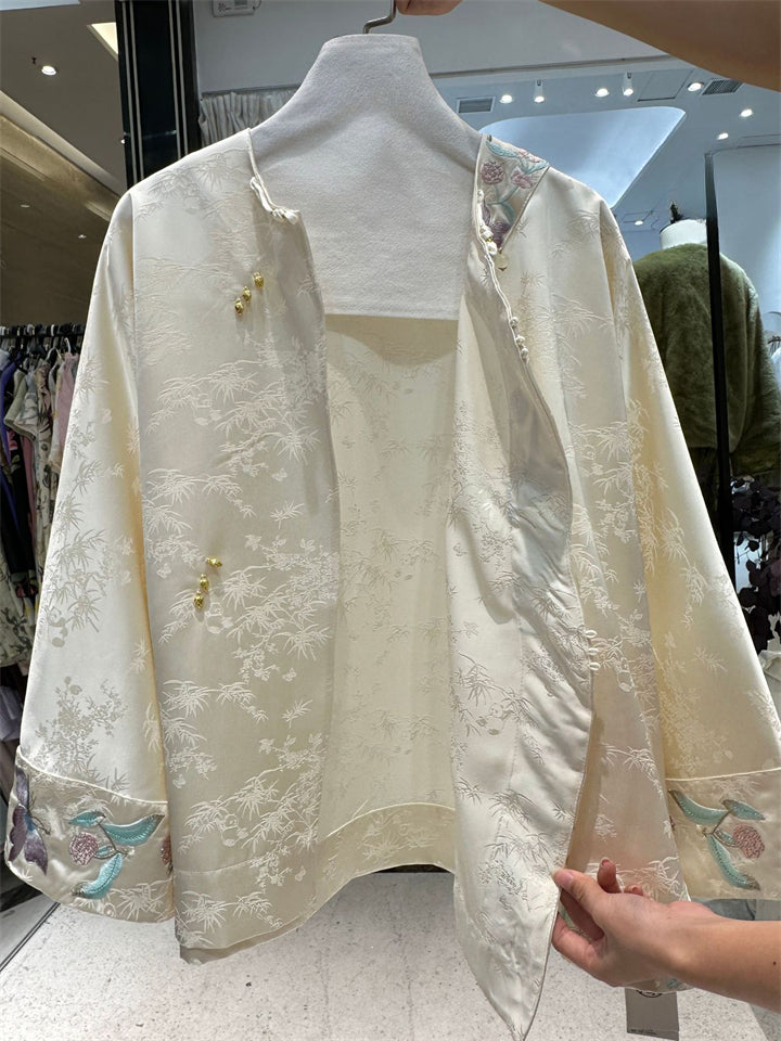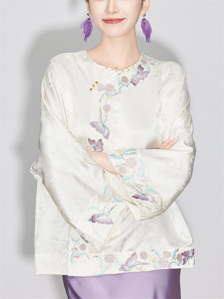 Chinese Style Round Neck Long Sleeve Jacquard Shirt for Women