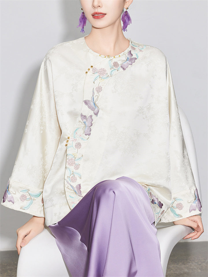 Ancient Chinese Style Floral Embroidery Linen Shirt for Women