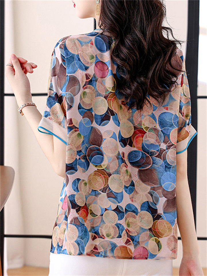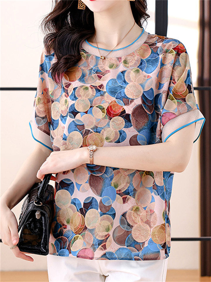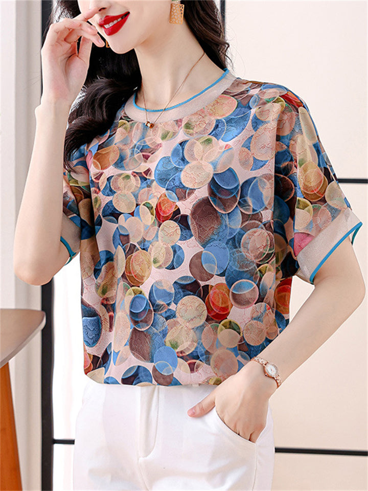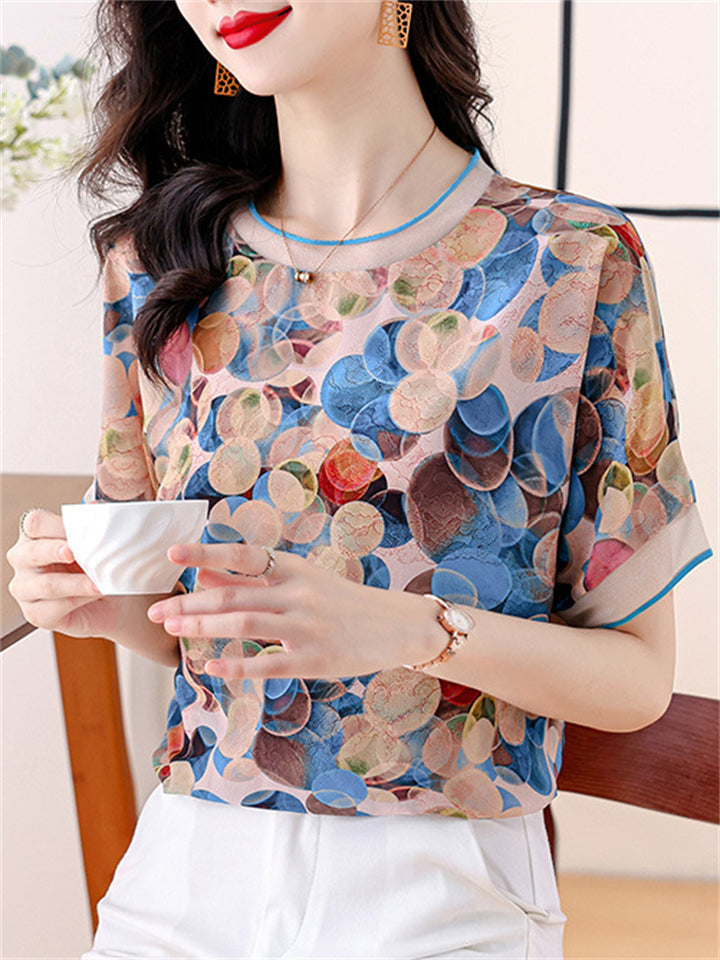 Comfy Elegant Summer Chiffon O-Neck Short Sleeve Shirt for Women